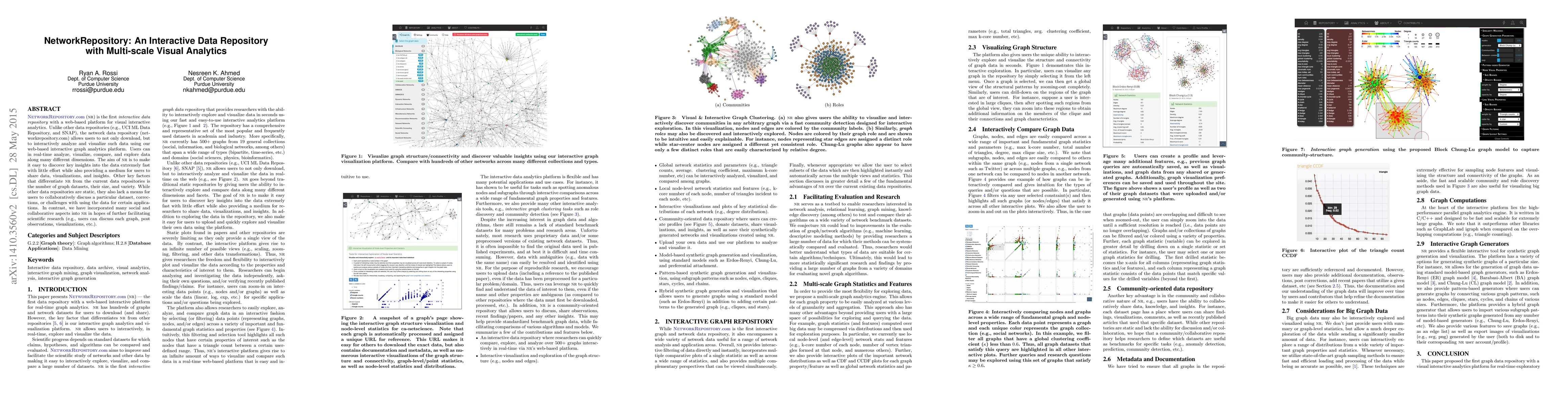 NetworkRepository (NR) offers an interactive web-based platform for multi-scale visual analytics of network data, enabling real-time exploration, comparison, and collaborative discussion. Unlike static data repositories, NR emphasizes social interaction and collaborative research, providing a rich environment for data sharing and insights discovery.