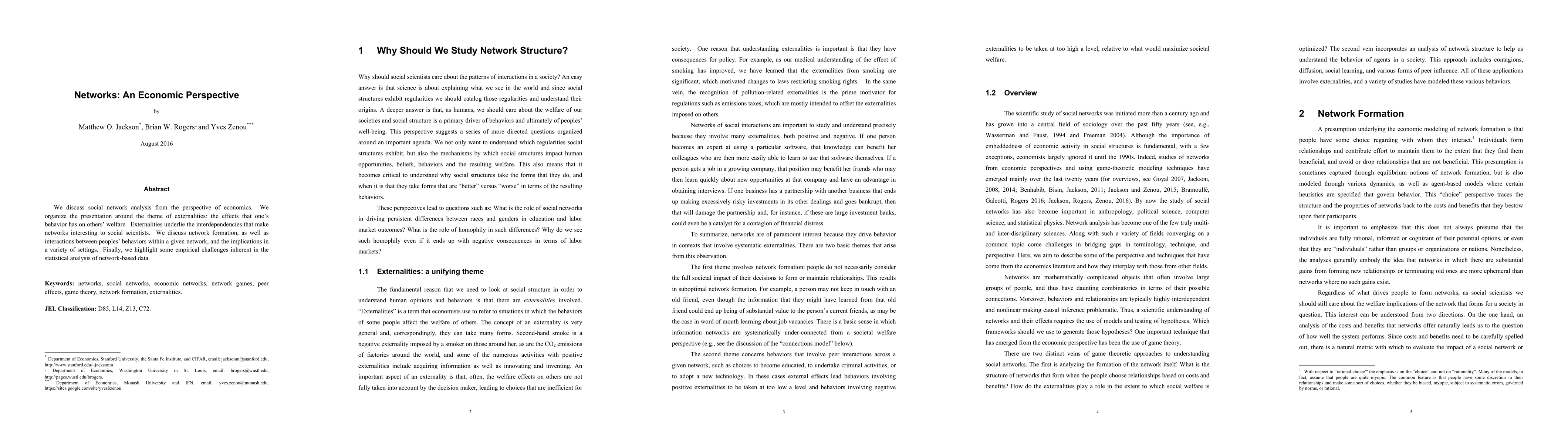 We discuss social network analysis from the perspective of economics. We organize the presentaion around the theme of externalities: the effects that one's behavior has on others' well-being. Externalities underlie the interdependencies that make networks interesting. We discuss network formation, as well as interactions between peoples' behaviors within a given network, and the implications in a variety of settings. Finally, we highlight some empirical challenges inherent in the statistical analysis of network-based data.
