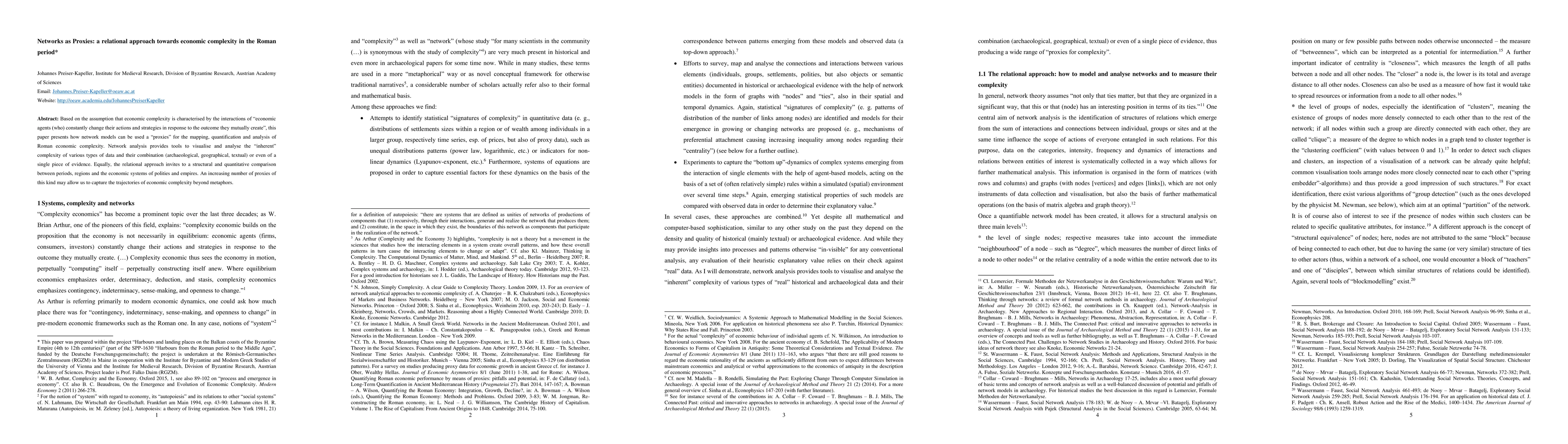 Based on the assumption that economic complexity is characterised by the interactions of economic agents (who) constantly change their actions and strategies in response to the outcome they mutually create, this paper presents how network models can be used a proxies for the mapping, quantification and analysis of Roman economic complexity. Network analysis provides tools to visualise and analyse the inherent complexity of various types of data and their combination (archaeological, geographical, textual) or even of a single piece of evidence. Equally, the relational approach invites to a structural and quantitative comparison between periods, regions and the economic systems of polities and empires. An increasing number of proxies of this kind may allow us to capture the trajectories of economic complexity beyond metaphors.