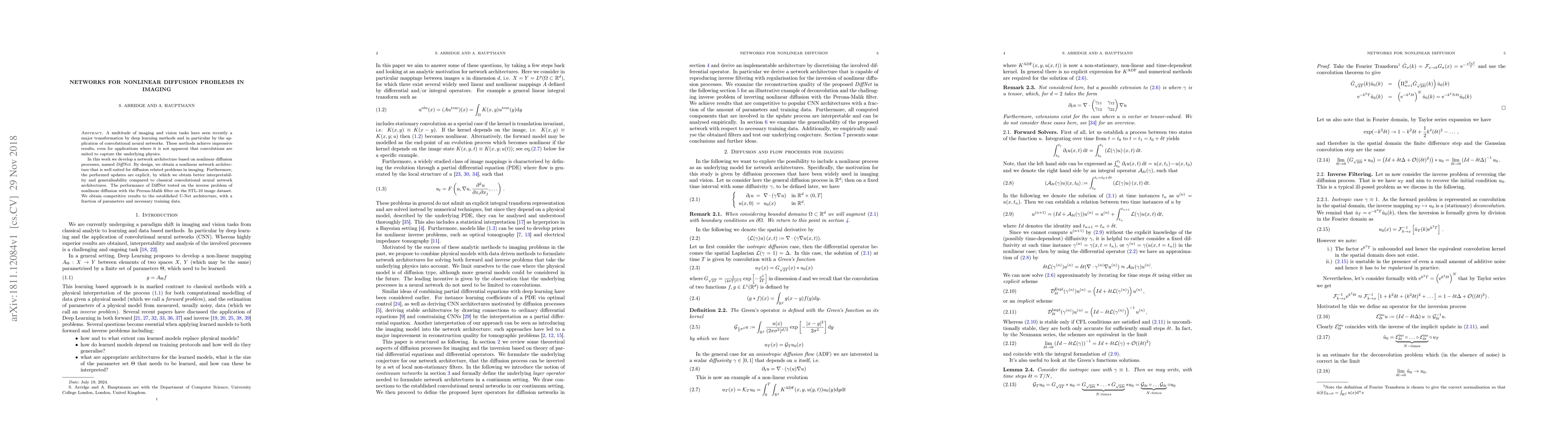 A multitude of imaging and vision tasks have seen recently a major transformation by deep learning methods and in particular by the application of convolutional neural networks. These methods achieve impressive results, even for applications where it is not apparent that convolutions are suited to capture the underlying physics. In this work we develop a network architecture based on nonlinear diffusion processes, named DiffNet. By design, we obtain a nonlinear network architecture that is well suited for diffusion related problems in imaging. Furthermore, the performed updates are explicit, by which we obtain better interpretability and generalisability compared to classical convolutional neural network architectures. The performance of DiffNet tested on the inverse problem of nonlinear diffusion with the Perona-Malik filter on the STL-10 image dataset. We obtain competitive results to the established U-Net architecture, with a fraction of parameters and necessary training data.