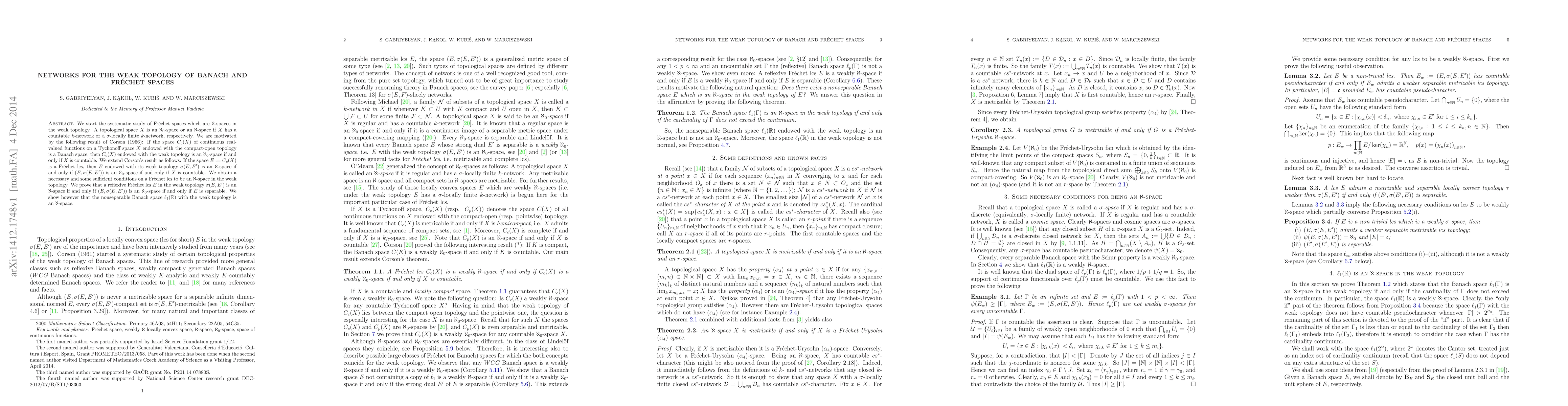 We start the systematic study of Fr\'{e}chet spaces which are $\aleph$-spaces in the weak topology. A topological space $X$ is an $\aleph_0$-space or an $\aleph$-space if $X$ has a countable $k$-network or a $\sigma$-locally finite $k$-network, respectively. We are motivated by the following result of Corson (1966): If the space $C_{c}(X)$ of continuous real-valued functions on a Tychonoff space $X$ endowed with the compact-open topology is a Banach space, then $C_{c}(X)$ endowed with the weak topology is an $\aleph_0$-space if and only if $X$ is countable. We extend Corson's result as follows: If the space $E:=C_{c}(X)$ is a Fr\'echet lcs, then $E$ endowed with its weak topology $\sigma(E,E')$ is an $\aleph$-space if and only if $(E,\sigma(E,E'))$ is an $\aleph_0$-space if and only if $X$ is countable. We obtain a necessary and some sufficient conditions on a Fr\'echet lcs to be an $\aleph$-space in the weak topology. We prove that a reflexive Fr\'echet lcs $E$ in the weak topology $\sigma(E,E')$ is an $\aleph$-space if and only if $(E,\sigma(E,E'))$ is an $\aleph_0$-space if and only if $E$ is separable. We show however that the nonseparable Banach space $\ell_{1}(\mathbb{R})$ with the weak topology is an $\aleph$-space.