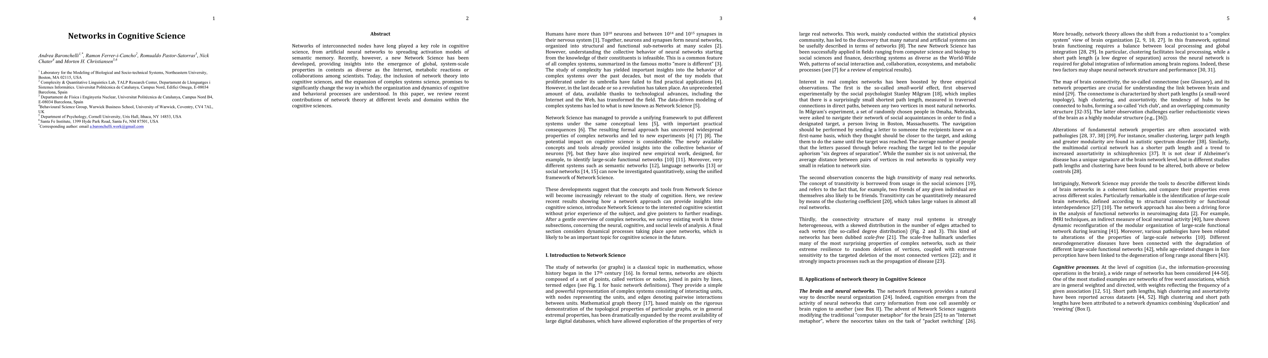 Networks of interconnected nodes have long played a key role in Cognitive Science, from artificial neural net- works to spreading activation models of semantic mem- ory. Recently, however, a new Network Science has been developed, providing insights into the emergence of global, system-scale properties in contexts as diverse as the Internet, metabolic reactions, and collaborations among scientists. Today, the inclusion of network theory into Cognitive Sciences, and the expansion of complex- systems science, promises to significantly change the way in which the organization and dynamics of cognitive and behavioral processes are understood. In this paper, we review recent contributions of network theory at different levels and domains within the Cognitive Sciences.
