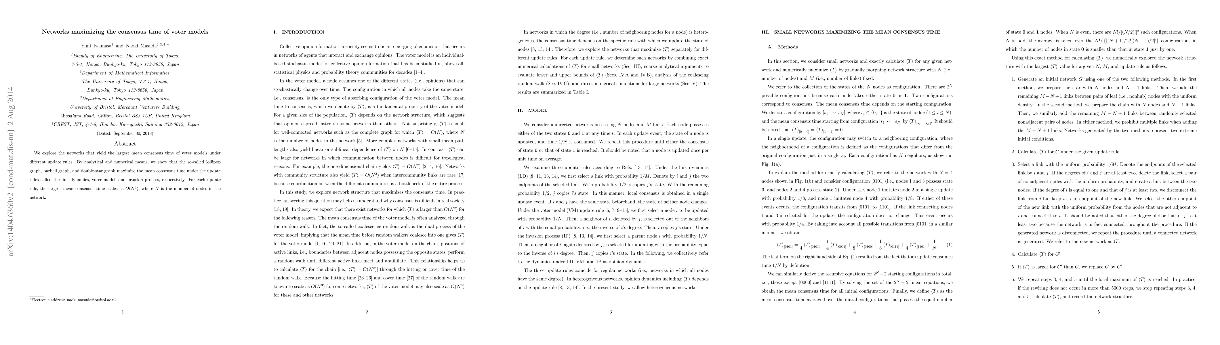 This paper finds that specific network structures - lollipop, barbell, and double star graphs - maximize consensus time in various voter model update rules, with the largest mean consensus time scaling as O(N^3) where N is the number of nodes.
