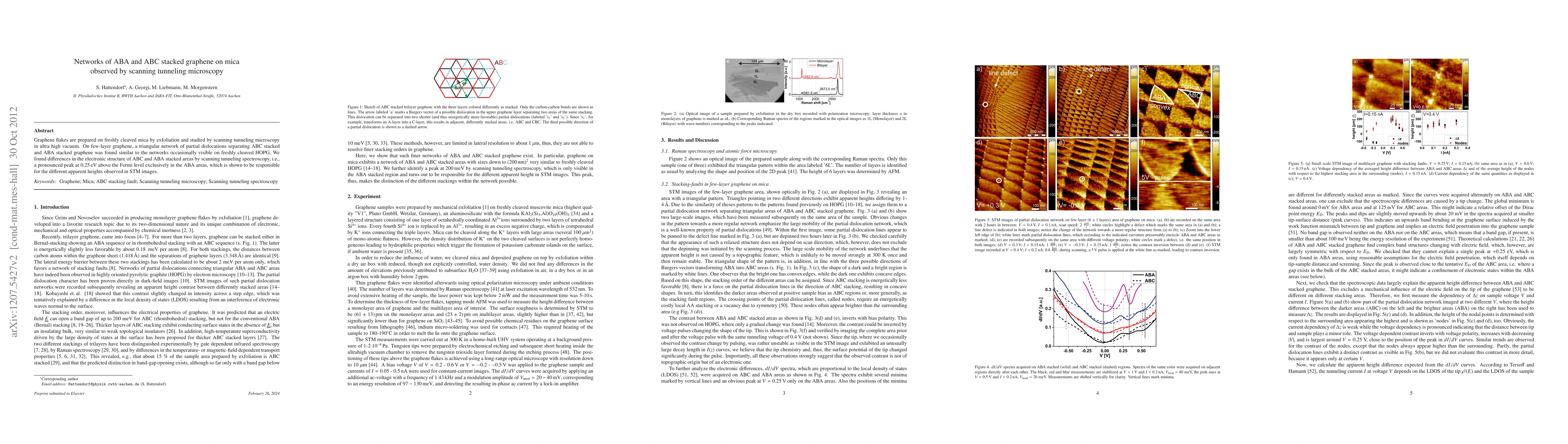 This research uses scanning tunneling microscopy to observe triangular dislocation networks in stacked graphene on mica, distinguishing between ABA and ABC configurations. The study reveals a unique electronic peak at 0.25 eV in ABA areas, impacting STM image height differences.