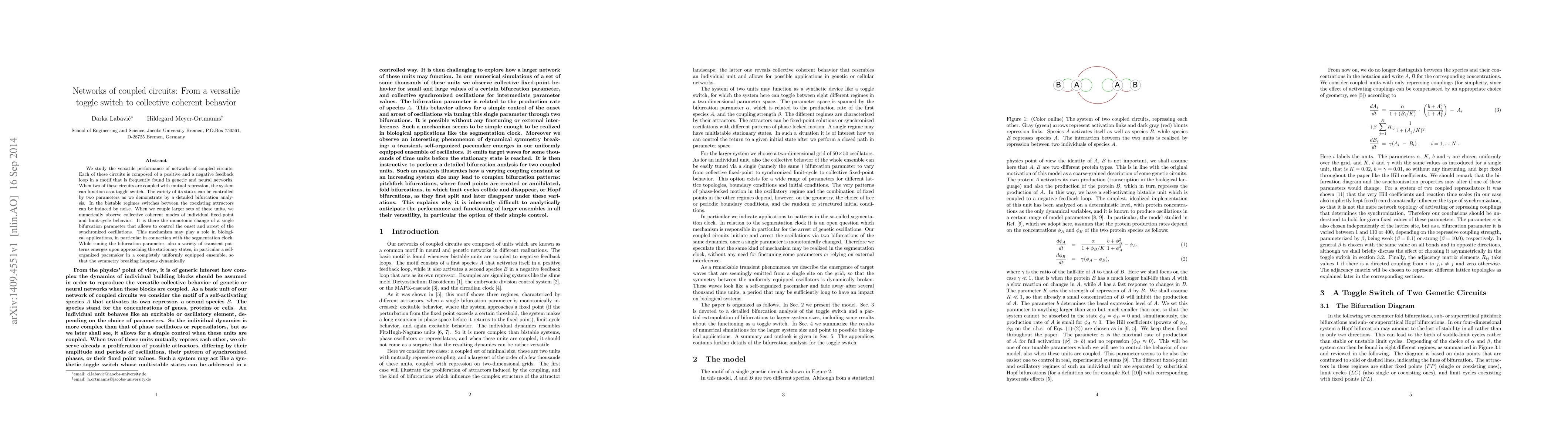 We study the versatile performance of networks of coupled circuits. Each of these circuits is composed of a positive and a negative feedback loop in a motif that is frequently found in genetic and neural networks. When two of these circuits are coupled with mutual repression, the system can function as a toggle switch. The variety of its states can be controlled by two parameters as we demonstrate by a detailed bifurcation analysis. In the bistable regimes switches between the coexisting attractors can be induced by noise. When we couple larger sets of these units, we numerically observe collective coherent modes of individual fixed-point and limit-cycle behavior. It is there the monotonic change of a single bifurcation parameter that allows to control the onset and arrest of the synchronized oscillations. This mechanism may play a role in biological applications, in particular in connection with the segmentation clock. While tuning the bifurcation parameter, also a variety of transient patterns emerges upon approaching the stationary states, in particular a self-organized pacemaker in a completely uniformly equipped ensemble, so that the symmetry breaking happens dynamically.