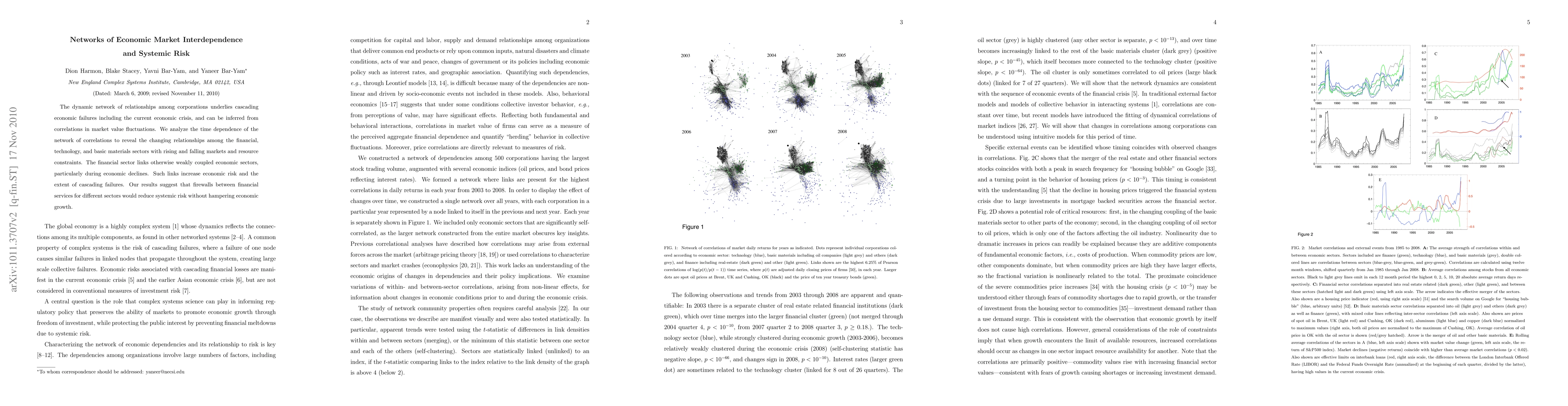 The dynamic network of relationships among corporations underlies cascading economic failures including the current economic crisis, and can be inferred from correlations in market value fluctuations. We analyze the time dependence of the network of correlations to reveal the changing relationships among the financial, technology, and basic materials sectors with rising and falling markets and resource constraints. The financial sector links otherwise weakly coupled economic sectors, particularly during economic declines. Such links increase economic risk and the extent of cascading failures. Our results suggest that firewalls between financial services for different sectors would reduce systemic risk without hampering economic growth.