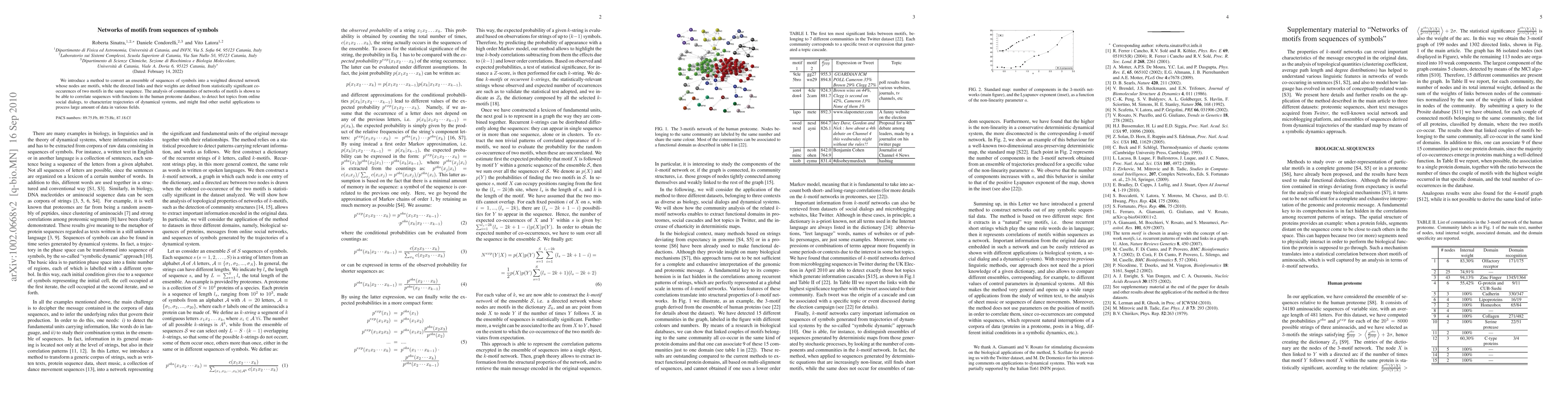 We introduce a method to convert an ensemble of sequences of symbols into a weighted directed network whose nodes are motifs, while the directed links and their weights are defined from statistically significant co-occurences of two motifs in the same sequence. The analysis of communities of networks of motifs is shown to be able to correlate sequences with functions in the human proteome database, to detect hot topics from online social dialogs, to characterize trajectories of dynamical systems, and might find other useful applications to process large amount of data in various fields.