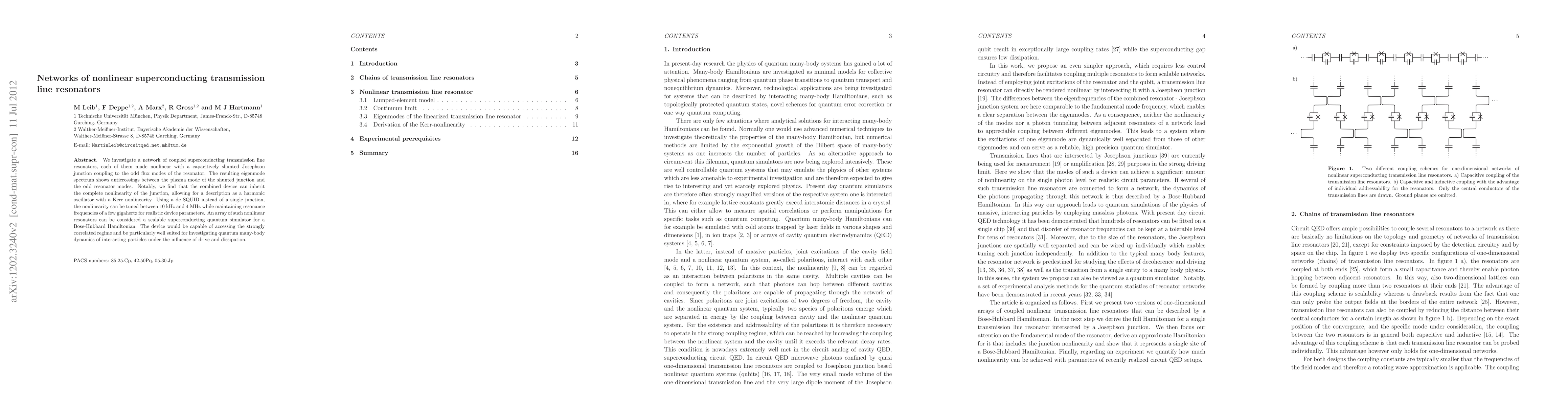 This paper explores a network of nonlinear superconducting transmission line resonators, each enhanced by a capacitively shunted Josephson junction. The study reveals anticrossings in the eigenmode spectrum and demonstrates the system's capability to inherit the junction's nonlinearity, functioning as a harmonic oscillator with Kerr nonlinearity. The device can be tuned for various applications, including a scalable quantum simulator for studying quantum many-body dynamics.