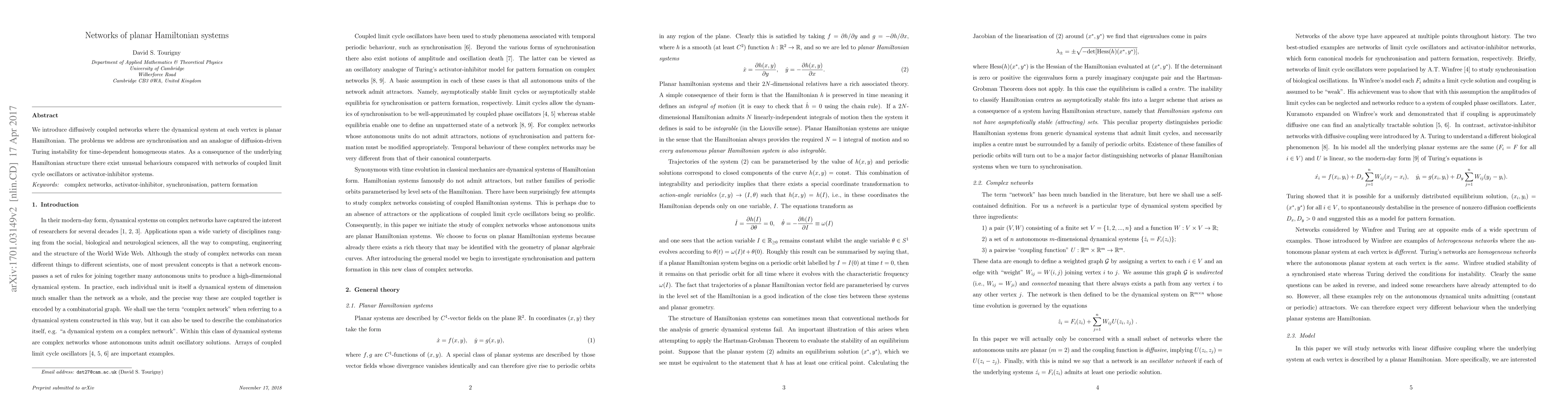 We introduce diffusively coupled networks where the dynamical system at each vertex is planar Hamiltonian. The problems we address are synchronisation and an analogue of diffusion-driven Turing instability for time-dependent homogeneous states. As a consequence of the underlying Hamiltonian structure there exist unusual behaviours compared with networks of coupled limit cycle oscillators or activator-inhibitor systems.