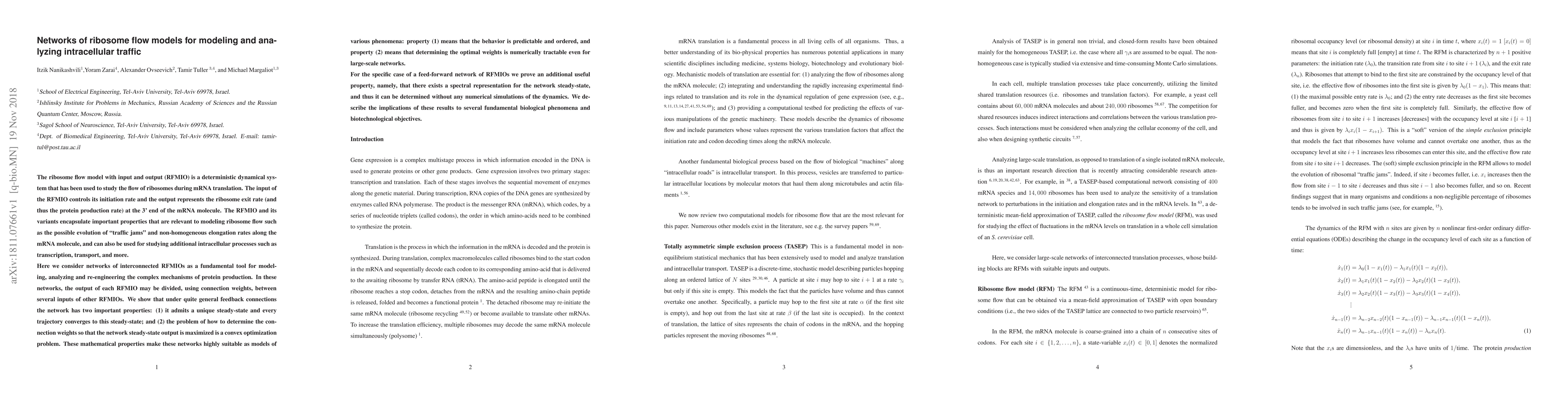 This research introduces Networks of Ribosome Flow Models (RFMIOs) to study complex protein production mechanisms. The networks, with unique steady-state properties and convex optimization for weight determination, offer predictable, orderly behavior and efficient numerical solutions, even for large-scale models. Special feed-forward networks have spectral representations for steady-state determination, aiding in understanding biological phenomena and biotechnological objectives.