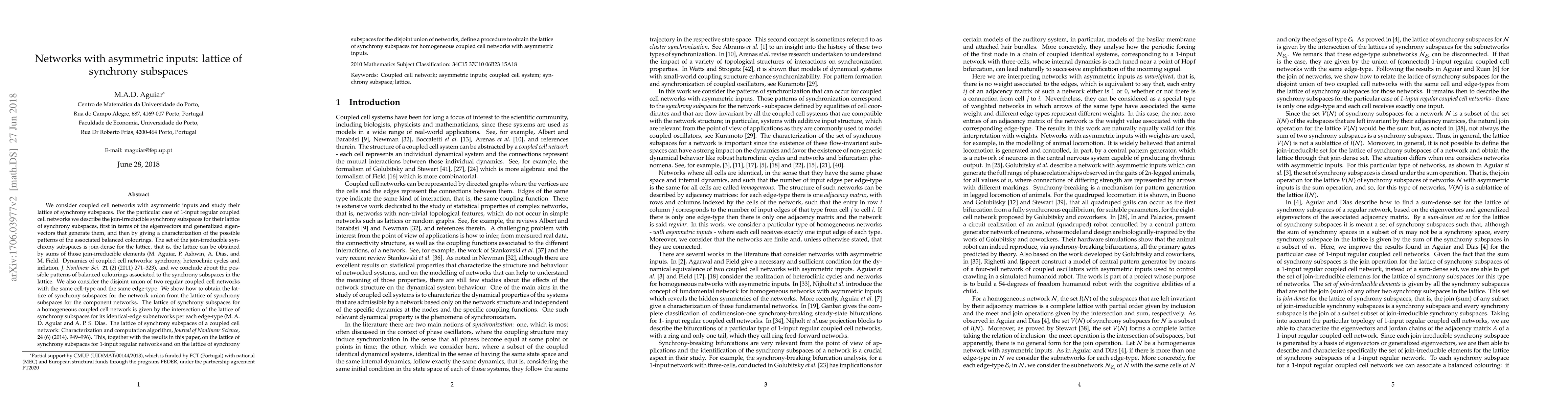 This paper studies coupled cell networks with asymmetric inputs, focusing on their lattice of synchrony subspaces. It describes join-irreducible synchrony subspaces for 1-input regular networks, characterizing their patterns via balanced colourings and showing how the lattice can be constructed from these elements. It also explores the lattice for the union of two regular coupled cell networks and provides a method for determining the lattice of synchrony subspaces for homogeneous networks with asymmetric inputs.
