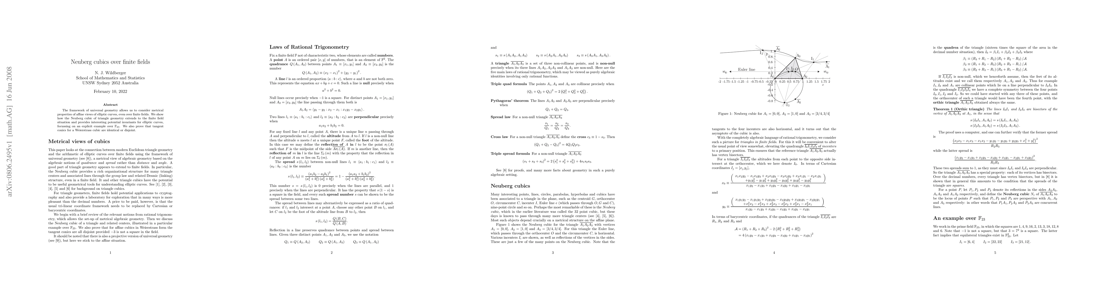 The framework of universal geometry allows us to consider metrical properties of affine views of elliptic curves, even over finite fields. We show how the Neuberg cubic of triangle geometry extends to the finite field situation and provides interesting potential invariants for elliptic curves, focussing on an explicit example over $\mathbb{F}_{23}$. We also prove that tangent conics for a Weierstrass cubic are identical or disjoint.