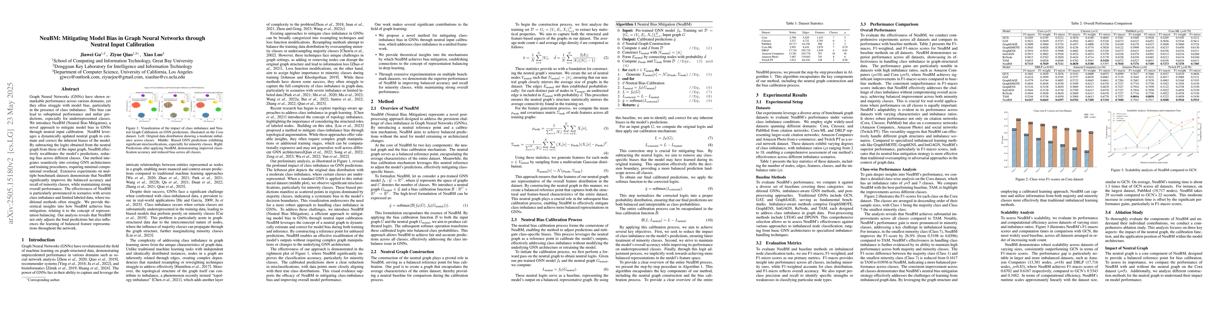Graph Neural Networks (GNNs) have shown remarkable performance across various domains, yet they often struggle with model bias, particularly in the presence of class imbalance. This bias can lead to suboptimal performance and unfair predictions, especially for underrepresented classes. We introduce NeuBM (Neutral Bias Mitigation), a novel approach to mitigate model bias in GNNs through neutral input calibration. NeuBM leverages a dynamically updated neutral graph to estimate and correct the inherent biases of the model. By subtracting the logits obtained from the neutral graph from those of the input graph, NeuBM effectively recalibrates the model's predictions, reducing bias across different classes. Our method integrates seamlessly into existing GNN architectures and training procedures, requiring minimal computational overhead. Extensive experiments on multiple benchmark datasets demonstrate that NeuBM significantly improves the balanced accuracy and recall of minority classes, while maintaining strong overall performance. The effectiveness of NeuBM is particularly pronounced in scenarios with severe class imbalance and limited labeled data, where traditional methods often struggle. We provide theoretical insights into how NeuBM achieves bias mitigation, relating it to the concept of representation balancing. Our analysis reveals that NeuBM not only adjusts the final predictions but also influences the learning of balanced feature representations throughout the network.