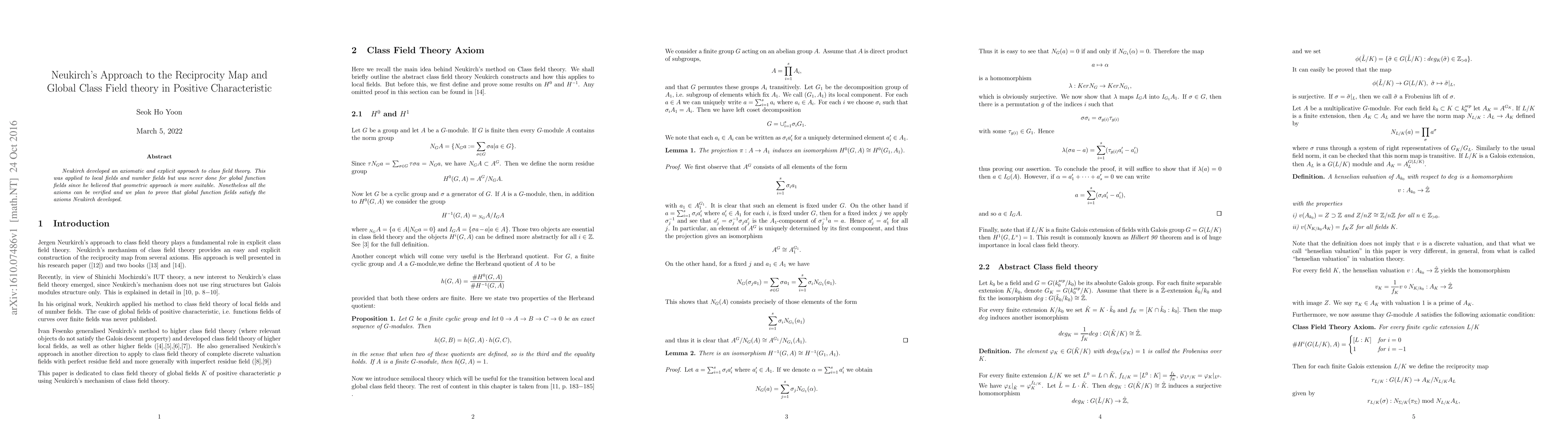 Neukirch's axiomatic approach to class field theory is applied to global function fields to verify its axioms, expanding on his prior work for local and number fields, which typically utilized geometric methods. The aim is to demonstrate that global function fields meet Neukirch's criteria.