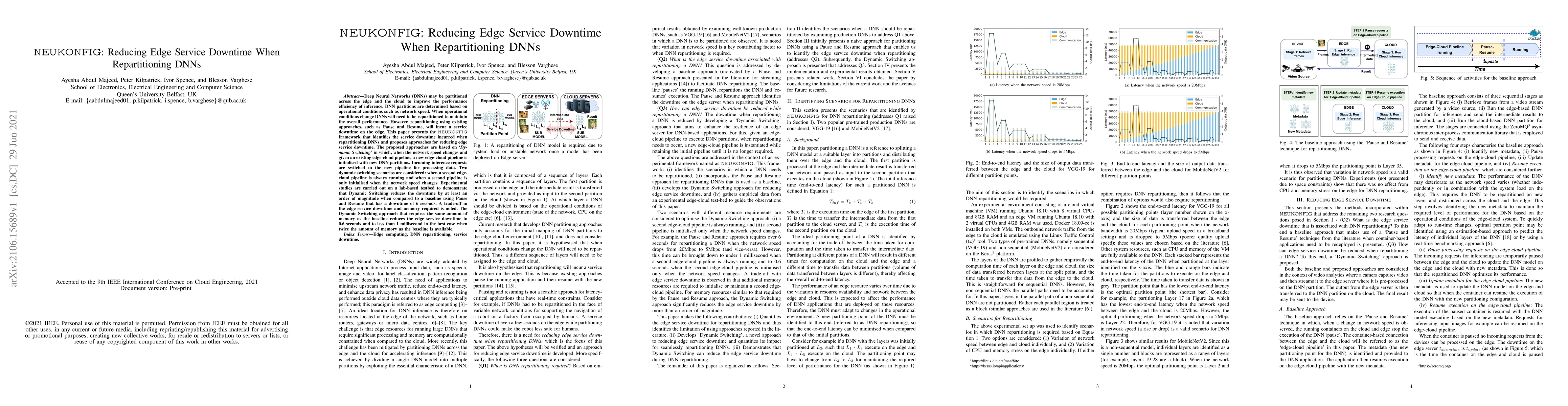 Deep Neural Networks (DNNs) may be partitioned across the edge and the cloud to improve the performance efficiency of inference. DNN partitions are determined based on operational conditions such as network speed. When operational conditions change DNNs will need to be repartitioned to maintain the overall performance. However, repartitioning using existing approaches, such as Pause and Resume, will incur a service downtime on the edge. This paper presents the NEUKONFIG framework that identifies the service downtime incurred when repartitioning DNNs and proposes approaches for reducing edge service downtime. The proposed approaches are based on 'Dynamic Switching' in which, when the network speed changes and given an existing edge-cloud pipeline, a new edge-cloud pipeline is initialised with new DNN partitions. Incoming inference requests are switched to the new pipeline for processing data. Two dynamic switching scenarios are considered: when a second edge-cloud pipeline is always running and when a second pipeline is only initialised when the network speed changes. Experimental studies are carried out on a lab-based testbed to demonstrate that Dynamic Switching reduces the downtime by at least an order of magnitude when compared to a baseline using Pause and Resume that has a downtime of 6 seconds. A trade-off in the edge service downtime and memory required is noted. The Dynamic Switching approach that requires the same amount of memory as the baseline reduces the edge service downtime to 0.6 seconds and to less than 1 millisecond in the best case when twice the amount of memory as the baseline is available.