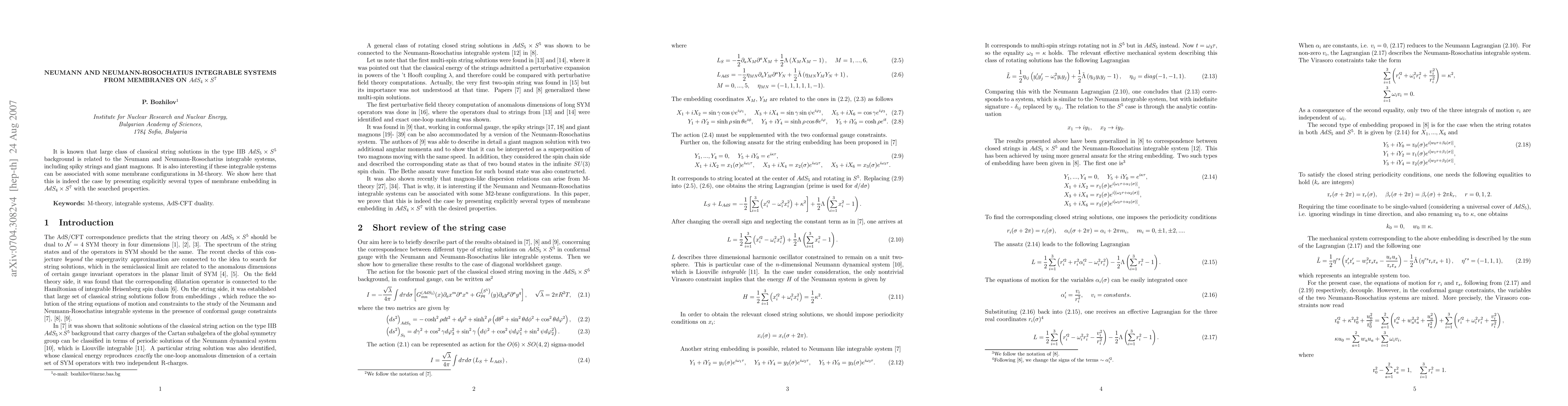 This paper demonstrates that Neumann and Neumann-Rosochatius integrable systems, previously linked to classical string solutions in AdS_5xS^5, can also be realized through specific membrane configurations in M-theory within the AdS_4xS^7 background. Several explicit membrane embeddings are presented to illustrate this association.
