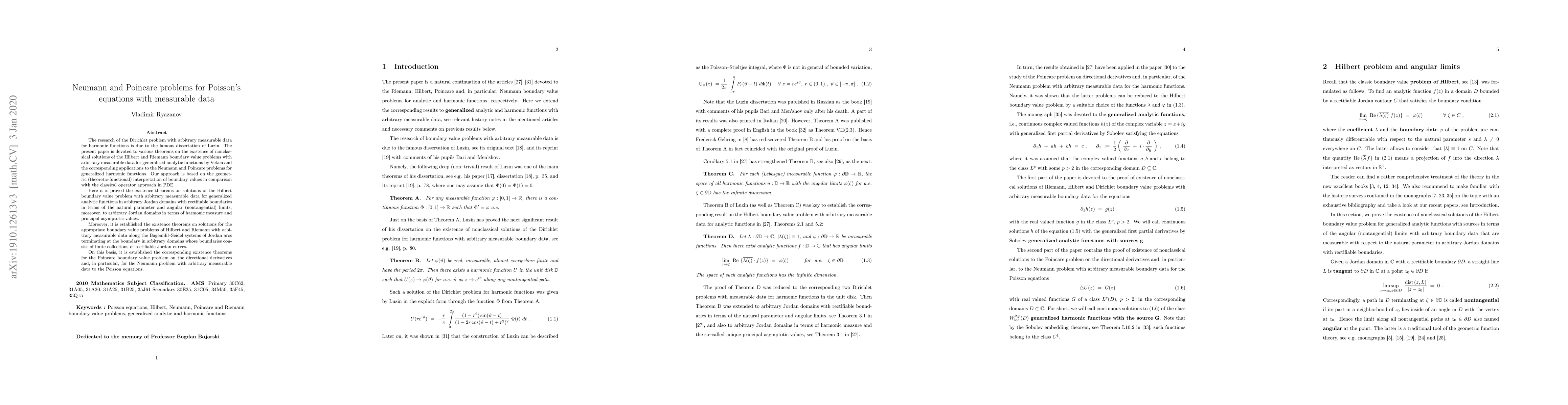 This paper explores the existence of nonclassical solutions for the Neumann and Poincaré problems related to Poisson's equations, utilizing generalized analytic functions and a geometric interpretation of boundary values. It establishes existence theorems for the Hilbert and Riemann boundary value problems with measurable data in various domains, extending to directional derivatives and the Neumann problem.