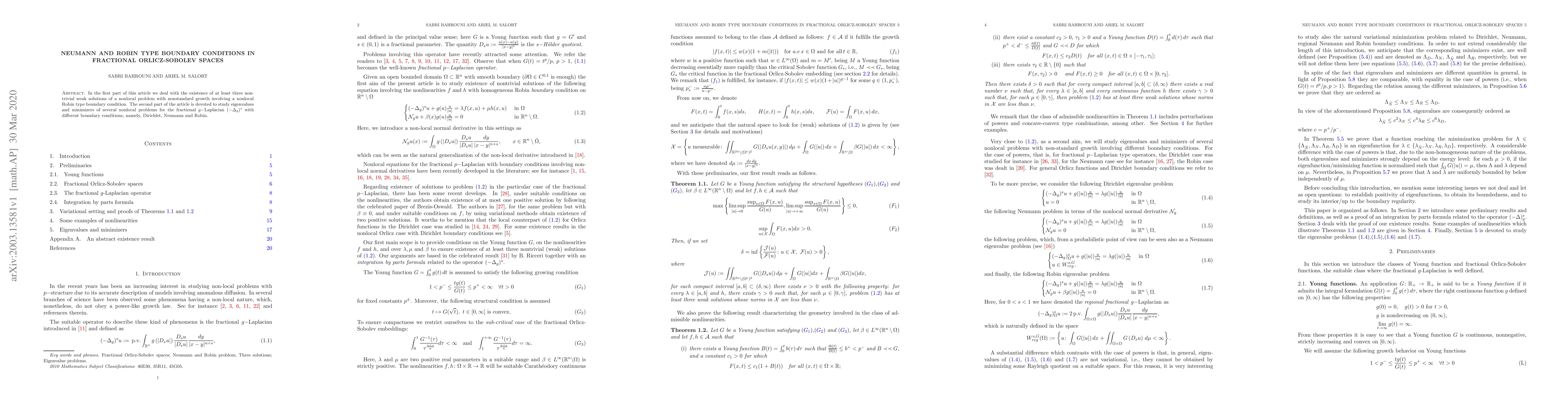 In the first part of this article we deal with the existence of at least three non-trivial weak solutions of a nonlocal problem with nonstandard growth involving a nonlocal Robin type boundary condition. The second part of the article is devoted to study eigenvalues and minimizers of several nonlocal problems for the fractional $g-$Laplacian $(-\Delta_g)^s$ with different boundary conditions, namely, Dirichlet, Neumann and Robin.
