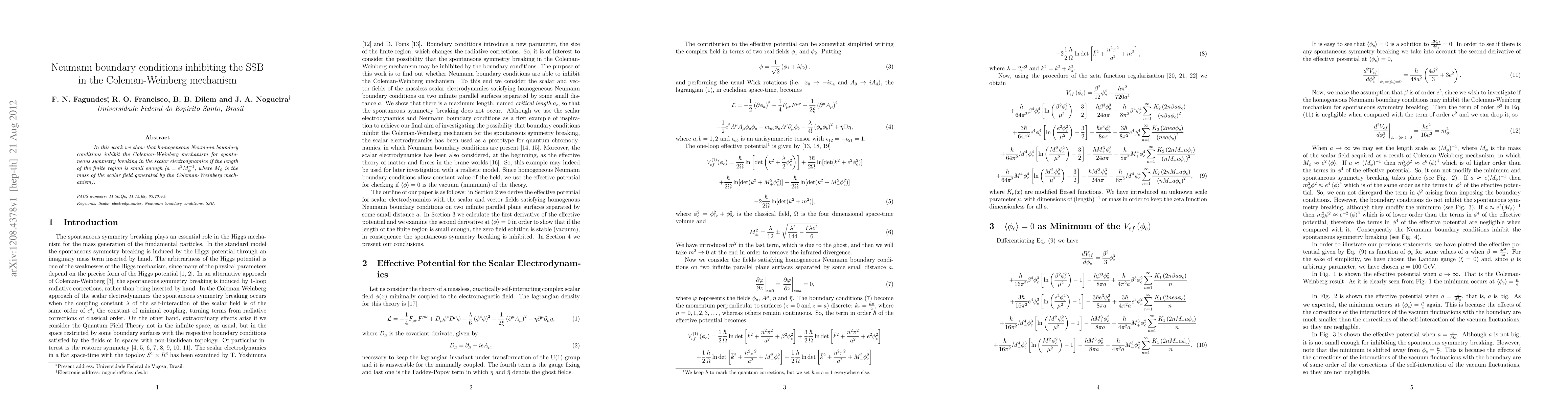 Summary: This paper demonstrates that homogeneous Neumann boundary conditions prevent the Coleman-Weinberg mechanism for spontaneous symmetry breaking in scalar electrodynamics when the finite region's length is sufficiently small, specifically when $a = e^{2}M^{-1}_{\phi}$. The inhibition occurs due to the boundary conditions' influence on the scalar field's mass.
