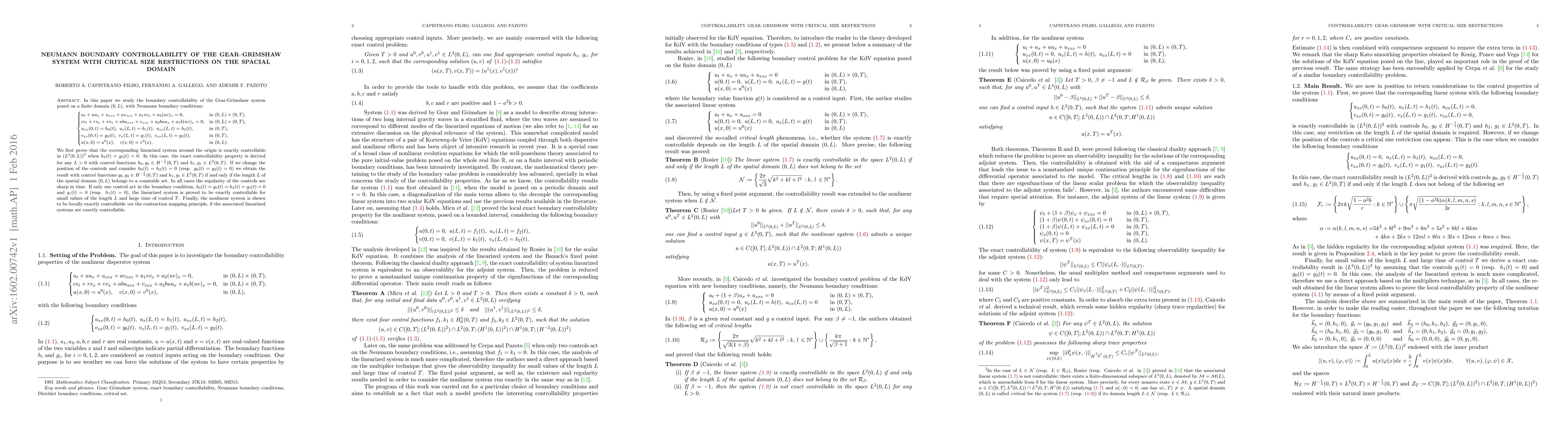 In this paper we study the boundary controllability of the Gear-Grimshaw system posed on a finite domain $(0,L)$, with Neumann boundary conditions: \begin{equation} \label{abs} \begin{cases} u_t + uu_x+u_{xxx} + a v_{xxx} + a_1vv_x+a_2 (uv)_x =0, & \text{in} \,\, (0,L)\times (0,T), c v_t +rv_x +vv_x+abu_{xxx} +v_{xxx}+a_2buu_x+a_1b(uv)_x =0, & \text{in} \,\, (0,L)\times (0,T), u_{xx}(0,t)=h_0(t),\,\,u_x(L,t)=h_1(t),\,\,u_{xx}(L,t)=h_2(t), & \text{in} \,\, (0,T), v_{xx}(0,t)=g_0(t),\,\,v_x(L,t)=g_1(t),\,\,v_{xx}(L,t)=g_2(t), & \text{in} \,\, (0,T), u(x,0)= u^0(x), \quad v(x,0)= v^0(x), & \text{in} \,\, (0,L).\nonumber \end{cases} \end{equation} We first prove that the corresponding linearized system around the origin is exactly controllable in $(L^2(0,L))^2$ when $h_2(t)=g_2(t)=0$. In this case, the exact controllability property is derived for any $L>0$ with control functions $h_0, g_0\in H^{-\frac{1}{3}}(0,T)$ and $h_1, g_1\in L^2(0,T)$. If we change the position of the controls and consider $h_0(t)=h_2(t)=0$ (resp. $g_0(t)=g_2(t)=0)$ we obtain the result with control functions $g_0, g_2\in H^{-\frac{1}{3}}(0,T)$ and $h_1, g_1\in L^2(0,T)$ if and only if the length $L$ of the spatial domain $(0,L)$ belongs to a countable set. In all cases the regularity of the controls are sharp in time. If only one control act in the boundary condition, $h_0(t)=g_0(t)=h_2(t)=g_2(t)=0$ and $g_1(t)=0$ (resp. $h_1(t)=0$), the linearized system is proved to be exactly controllable for small values of the length $L$ and large time of control $T$. Finally, the nonlinear system is shown to be locally exactly controllable via the contraction mapping principle, if the associated linearized systems are exactly controllable.