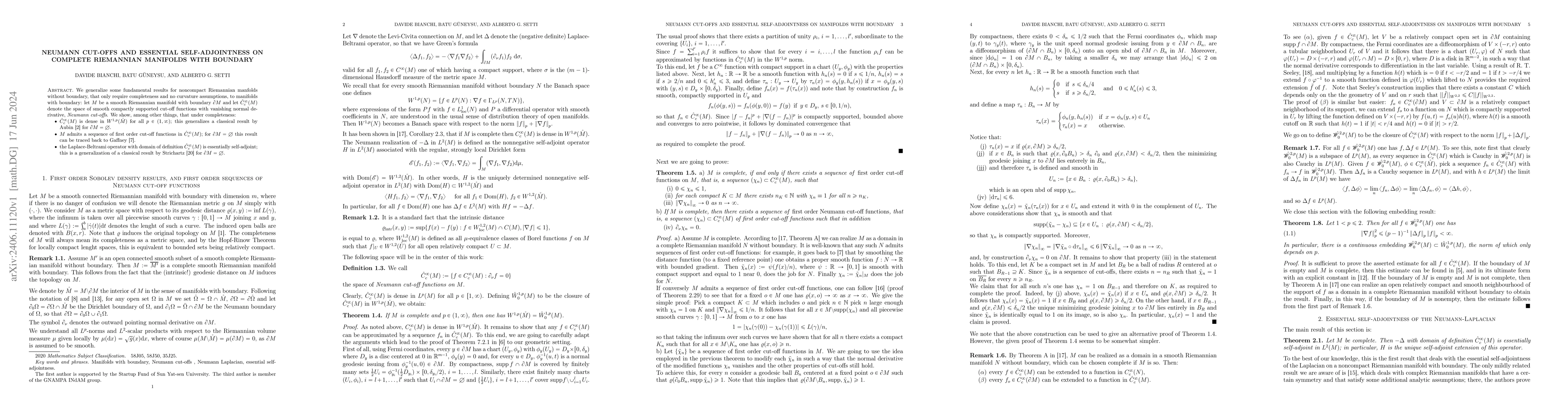This paper generalizes classical results regarding self-adjointness and density properties of cut-off functions on noncompact Riemannian manifolds to complete manifolds with boundary. It proves that Neumann cut-off functions are dense in $W^{1,p}$ spaces and the Laplace-Beltrami operator is essentially self-adjoint when defined on these cut-off functions.