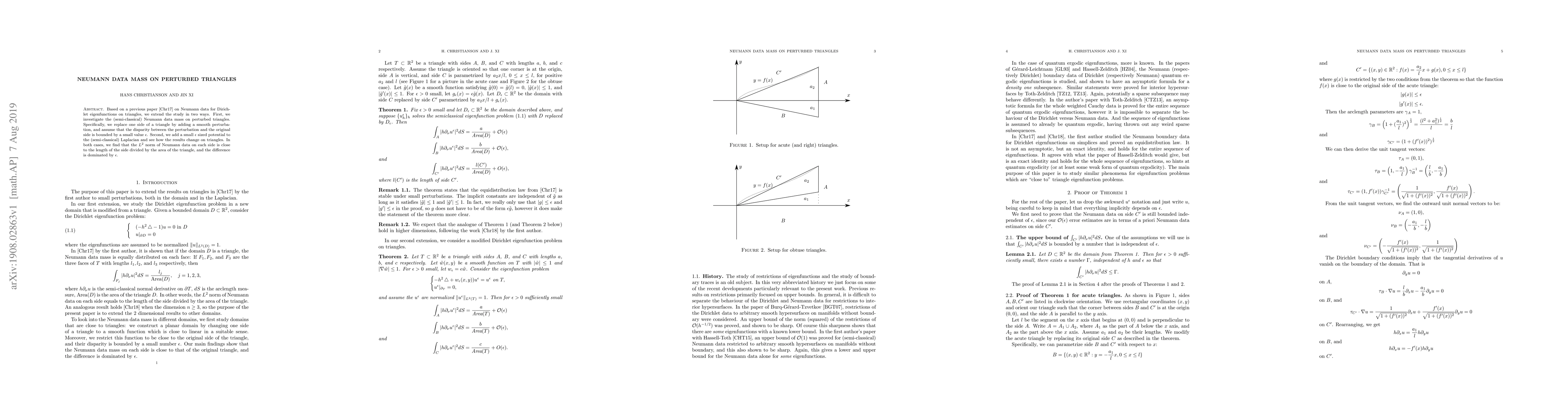 This research extends the study of Neumann data for Dirichlet eigenfunctions on triangles, focusing on perturbed triangles and the addition of a small potential. It finds that the L^2 norm of Neumann data on each side closely matches the side length divided by the triangle's area, with differences primarily due to perturbation size epsilon.