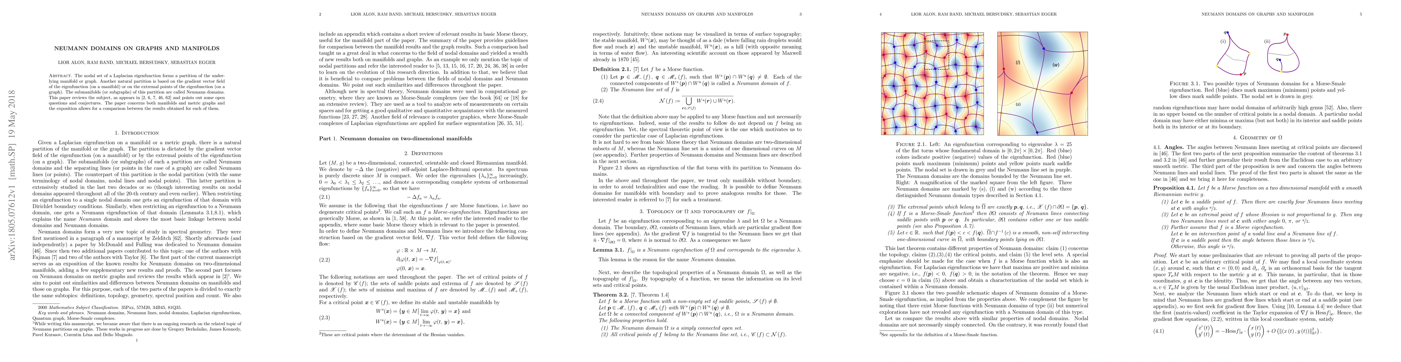 This paper reviews the concept of Neumann domains, which are submanifolds (or subgraphs) defined by the gradient vector field or extremal points of Laplacian eigenfunctions, and compares results from recent works on both manifolds and metric graphs. It highlights open questions and conjectures in the field.