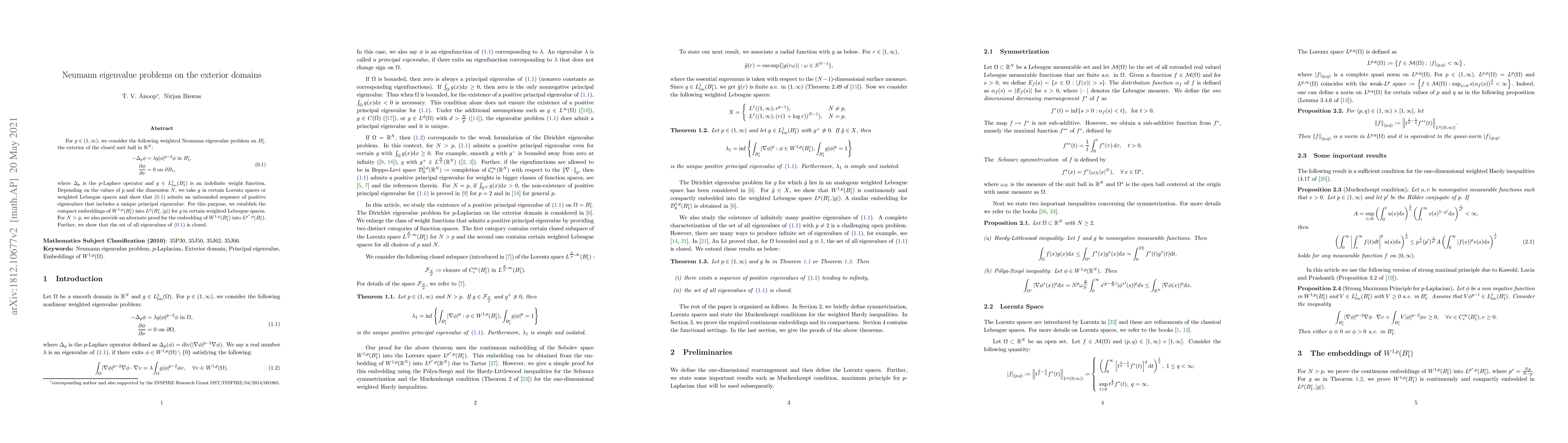 For $ p\in (1, \infty)$, we consider the following weighted Neumann eigenvalue problem on $B_1^c$, the exterior of the closed unit ball in $R^N$: \begin{equation}\label{Neumann eqn} \begin{aligned} -\Delta_p \phi & = \lambda g |\phi|^{p-2} \phi \ \text{in}\ B^c_1, \\ \displaystyle\frac{\partial \phi}{\partial \nu} &= 0 \ \text{on} \ \partial B_1, \end{aligned} \end{equation} where $\Delta_p$ is the $p$-Laplace operator and $g \in L^1_{loc}(B^c_1)$ is an indefinite weight function. Depending on the values of $p$ and the dimension $N$, we take $g$ in certain Lorentz spaces or weighted Lebesgue spaces and show that the above eigenvalue problem admits an unbounded sequence of positive eigenvalues that includes a unique principal eigenvalue. For this purpose, we establish the compact embeddings of $W^{1,p}(B^c_1)$ into $L^p(B^c_1, |g|)$ for $g$ in certain weighted Lebesgue spaces. For $N>p$, we also provide an alternate proof for the embedding of $W^{1,p}(B^c_1)$ into $L^{p^*,p}(B^c_1)$. Further, we show that the set of all eigenvalues is closed.