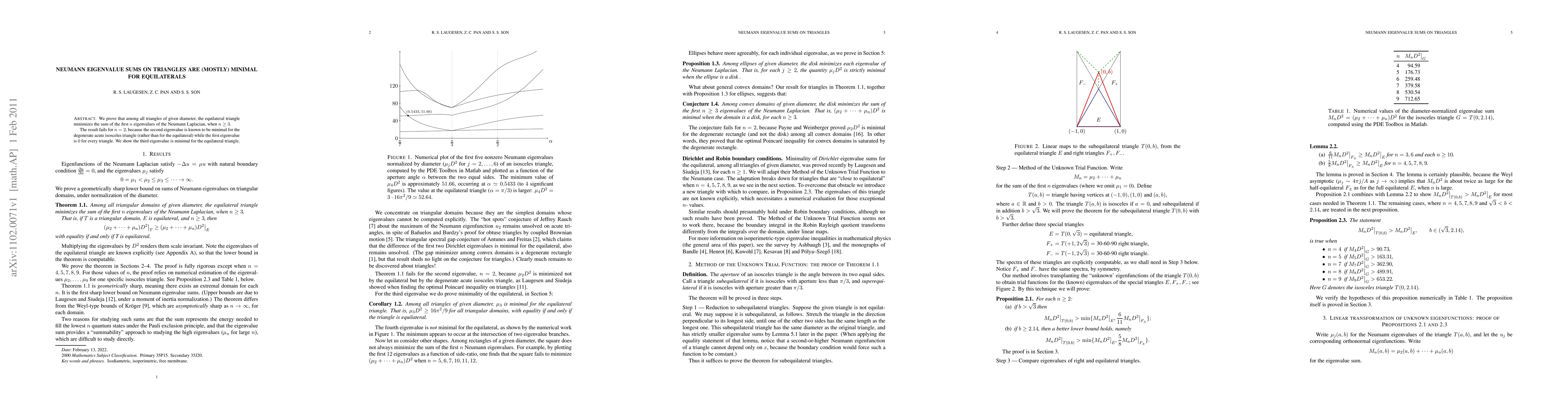 The equilateral triangle minimizes the sum of its first $n$ eigenvalues of the Neumann Laplacian for $n geq 3$, with the third eigenvalue being minimal.