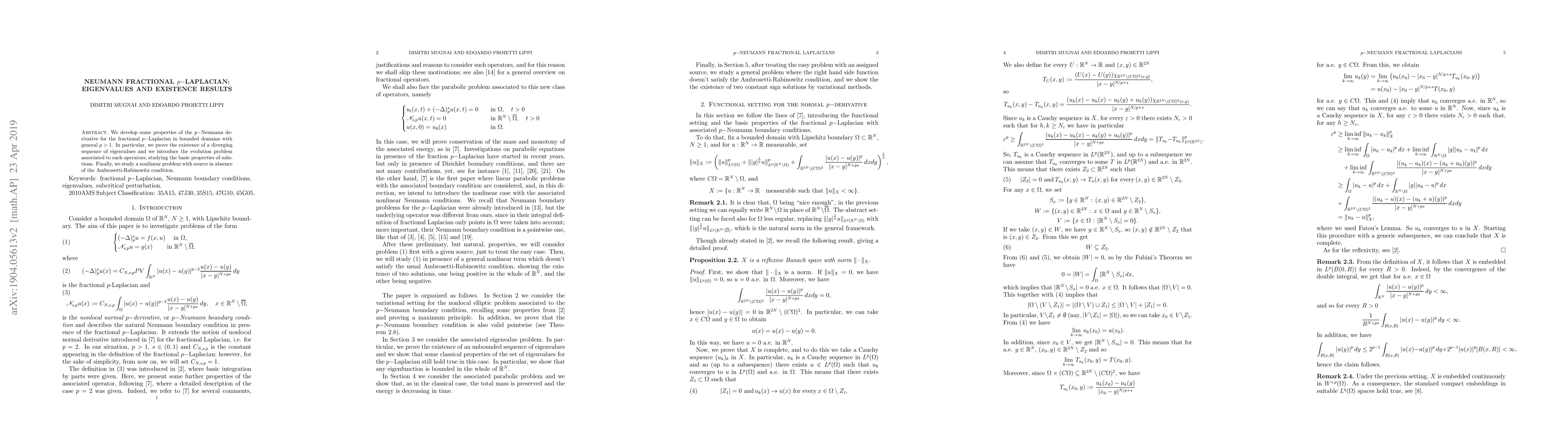 This paper explores the properties of the fractional $p-$Laplacian with Neumann boundary conditions, proving the existence of a diverging sequence of eigenvalues and investigating the evolution problem associated with these operators. It also examines a nonlinear problem without the Ambrosetti-Rabinowitz condition.