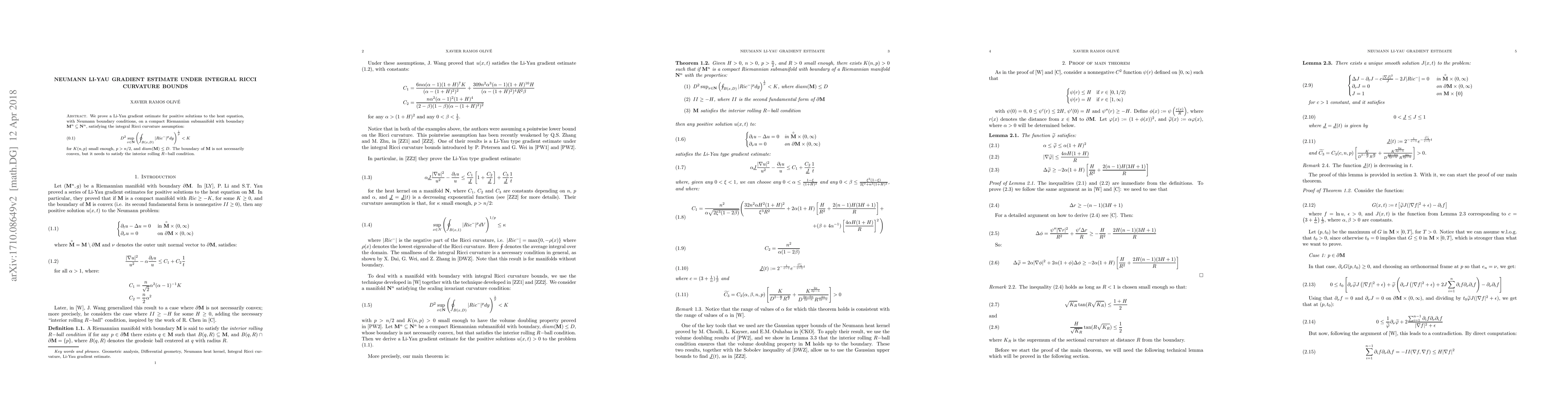 We prove a Li-Yau gradient estimate for positive solutions to the heat equation, with Neumann boundary conditions, on a compact Riemannian submanifold with boundary ${\bf M}^n\subseteq {\bf N}^n$, satisfying the integral Ricci curvature assumption: \begin{equation} D^2 \sup_{x\in {\bf N}} \left( \oint_{B(x,D)} |Ric^-|^p dy \right)^{\frac{1}{p}} < K \end{equation} for $K(n,p)$ small enough, $p>n/2$, where $diam({\bf M})\leq D$. The boundary of ${\bf M}$ is not necessarily convex, but it needs to satisfy the interior rolling $R-$ball condition.
