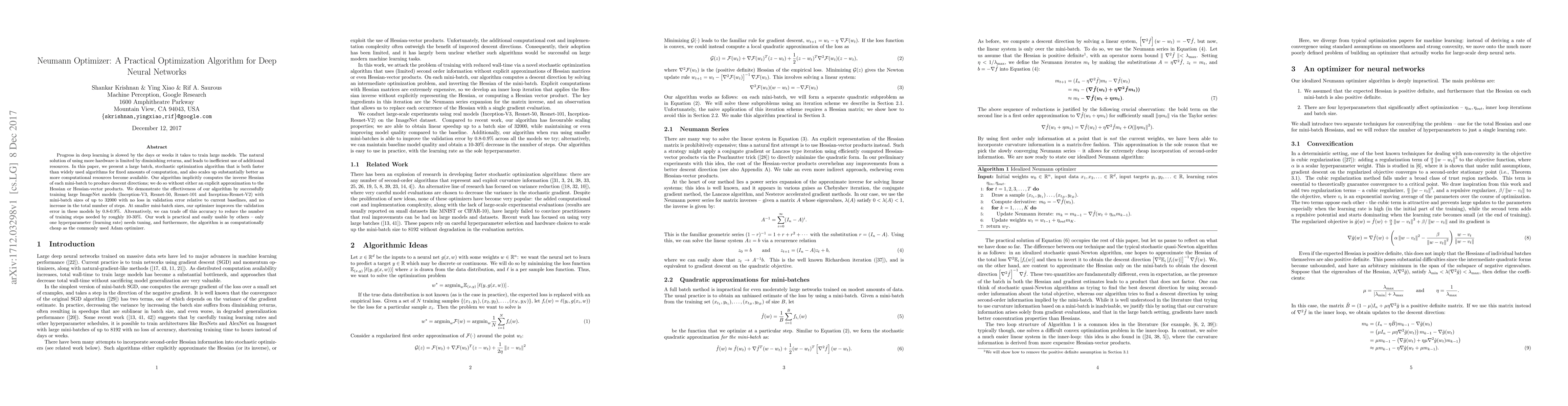 Progress in deep learning is slowed by the days or weeks it takes to train large models. The natural solution of using more hardware is limited by diminishing returns, and leads to inefficient use of additional resources. In this paper, we present a large batch, stochastic optimization algorithm that is both faster than widely used algorithms for fixed amounts of computation, and also scales up substantially better as more computational resources become available. Our algorithm implicitly computes the inverse Hessian of each mini-batch to produce descent directions; we do so without either an explicit approximation to the Hessian or Hessian-vector products. We demonstrate the effectiveness of our algorithm by successfully training large ImageNet models (Inception-V3, Resnet-50, Resnet-101 and Inception-Resnet-V2) with mini-batch sizes of up to 32000 with no loss in validation error relative to current baselines, and no increase in the total number of steps. At smaller mini-batch sizes, our optimizer improves the validation error in these models by 0.8-0.9%. Alternatively, we can trade off this accuracy to reduce the number of training steps needed by roughly 10-30%. Our work is practical and easily usable by others -- only one hyperparameter (learning rate) needs tuning, and furthermore, the algorithm is as computationally cheap as the commonly used Adam optimizer.