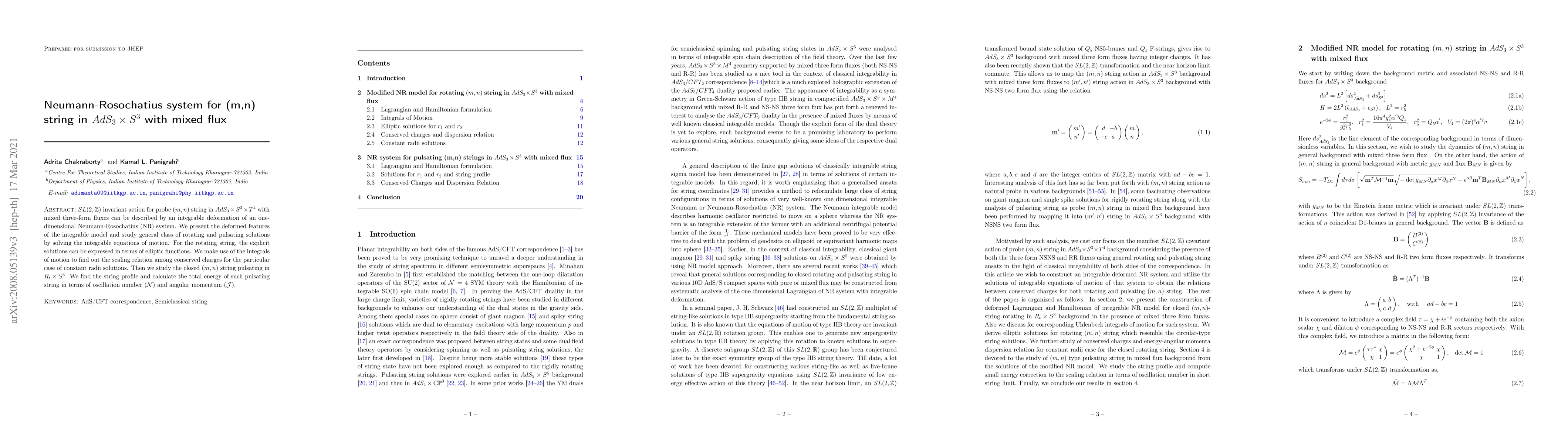 This paper presents an integrable deformation of the Neumann-Rosochatius system to describe the $SL(2,\mathbb{Z})$ invariant action for a probe $(m,n)$ string in $AdS_3\times S^3\times T^4$ with mixed flux. The study provides explicit rotating solutions in terms of elliptic functions and explores pulsating string profiles, calculating total energy in terms of oscillation number and angular momentum.