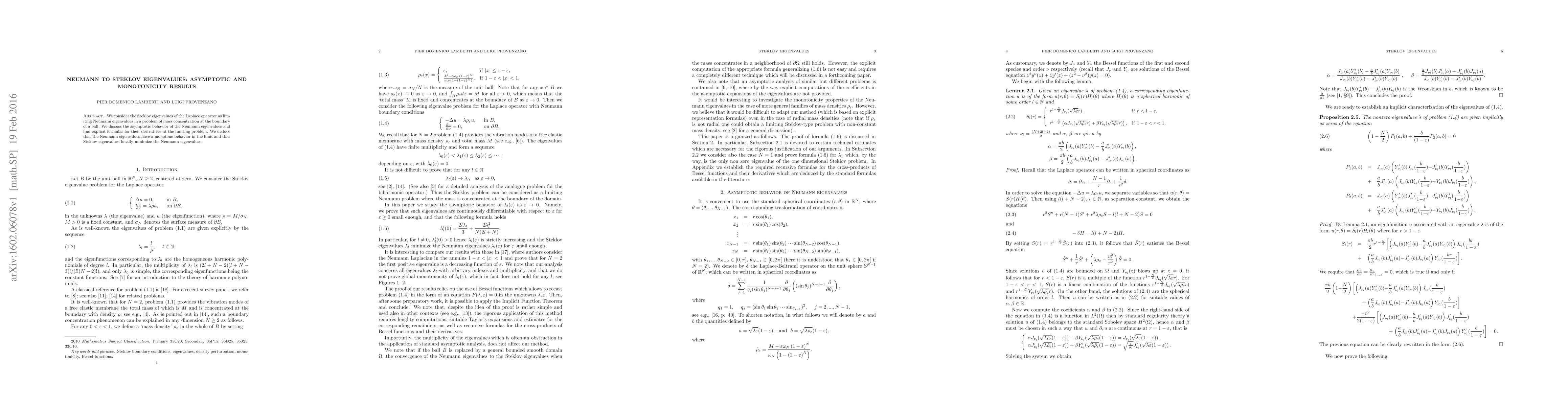 We consider the Steklov eigenvalues of the Laplace operator as limiting Neumann eigenvalues in a problem of mass concentration at the boundary of a ball. We discuss the asymptotic behavior of the Neumann eigenvalues and find explicit formulas for their derivatives at the limiting problem. We deduce that the Neumann eigenvalues have a monotone behavior in the limit and that Steklov eigenvalues locally minimize the Neumann eigenvalues.