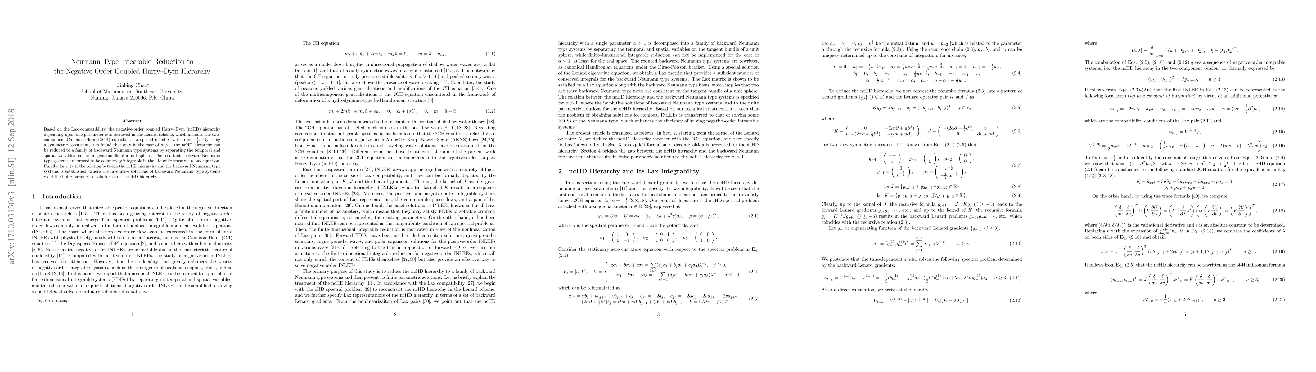 This paper retrieves the negative-order coupled Harry-Dym hierarchy via Lax compatibility and reduces it to a family of backward Neumann type systems for $\alpha > 1$. The resultant systems are shown to be completely integrable, with solutions of these systems providing finite parametric solutions to the original hierarchy.