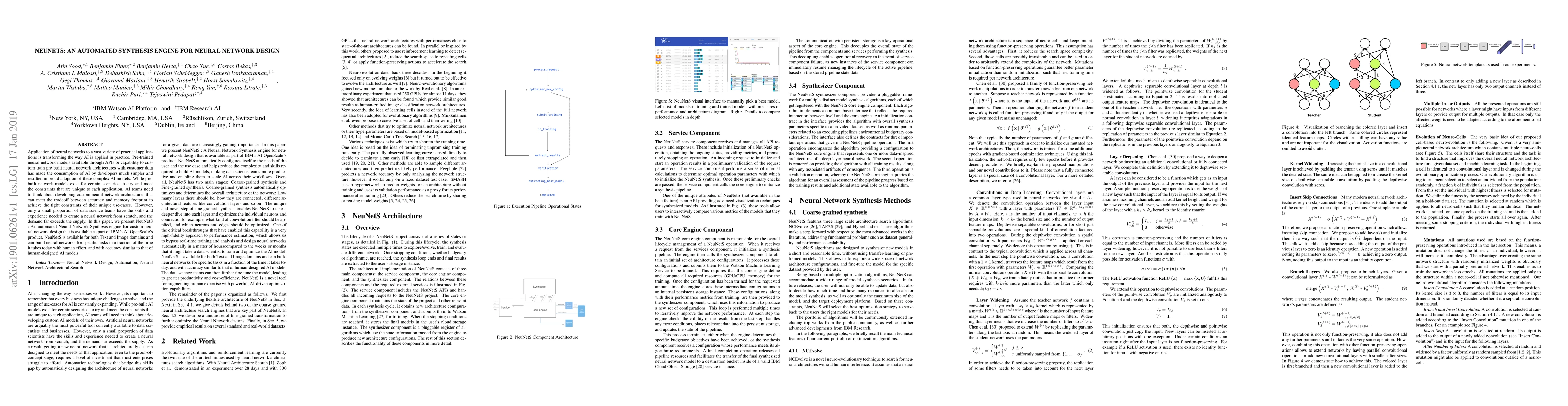 Application of neural networks to a vast variety of practical applications is transforming the way AI is applied in practice. Pre-trained neural network models available through APIs or capability to custom train pre-built neural network architectures with customer data has made the consumption of AI by developers much simpler and resulted in broad adoption of these complex AI models. While prebuilt network models exist for certain scenarios, to try and meet the constraints that are unique to each application, AI teams need to think about developing custom neural network architectures that can meet the tradeoff between accuracy and memory footprint to achieve the tight constraints of their unique use-cases. However, only a small proportion of data science teams have the skills and experience needed to create a neural network from scratch, and the demand far exceeds the supply. In this paper, we present NeuNetS : An automated Neural Network Synthesis engine for custom neural network design that is available as part of IBM's AI OpenScale's product. NeuNetS is available for both Text and Image domains and can build neural networks for specific tasks in a fraction of the time it takes today with human effort, and with accuracy similar to that of human-designed AI models.