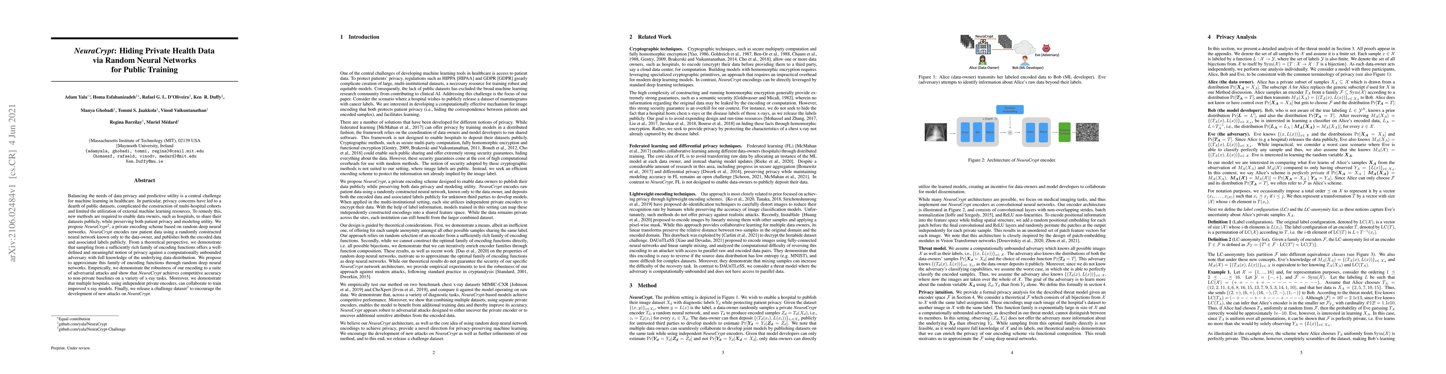 NeuraCrypt proposes a private encoding scheme using random neural networks to share healthcare data publicly while preserving patient privacy and maintaining modeling utility. The method demonstrates robust privacy against adversarial attacks and competitive accuracy on x-ray tasks, enabling multi-hospital collaboration for improved models.