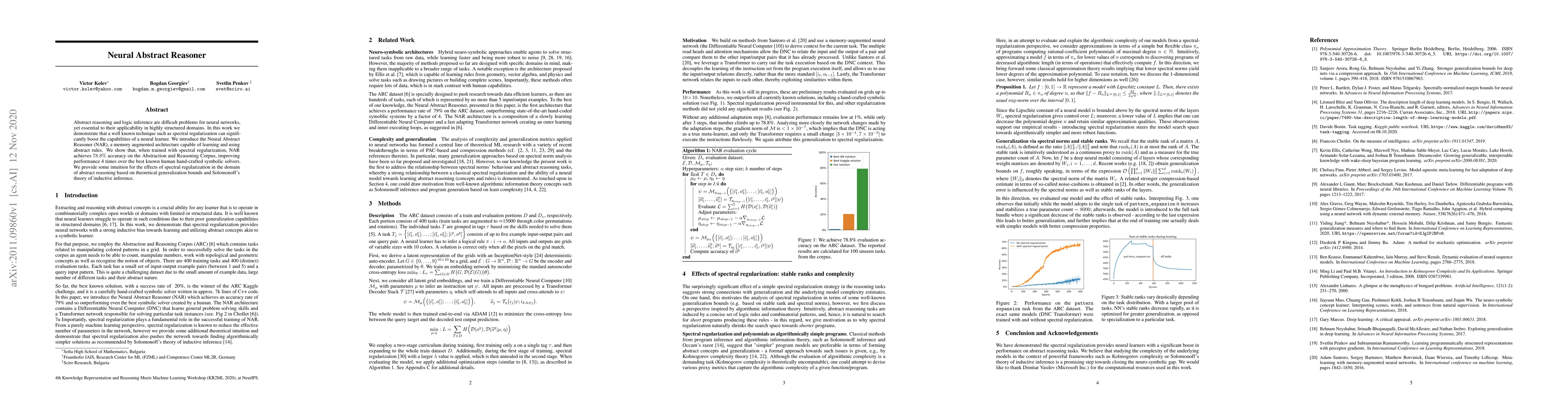 The Neural Abstract Reasoner (NAR) employs spectral regularization to enhance neural networks' abstract reasoning and logic inference capabilities, achieving 78.8% accuracy on the Abstraction and Reasoning Corpus, outperforming human-designed symbolic solvers by fourfold. The paper connects spectral regularization's effects to theoretical generalization and inductive inference principles.