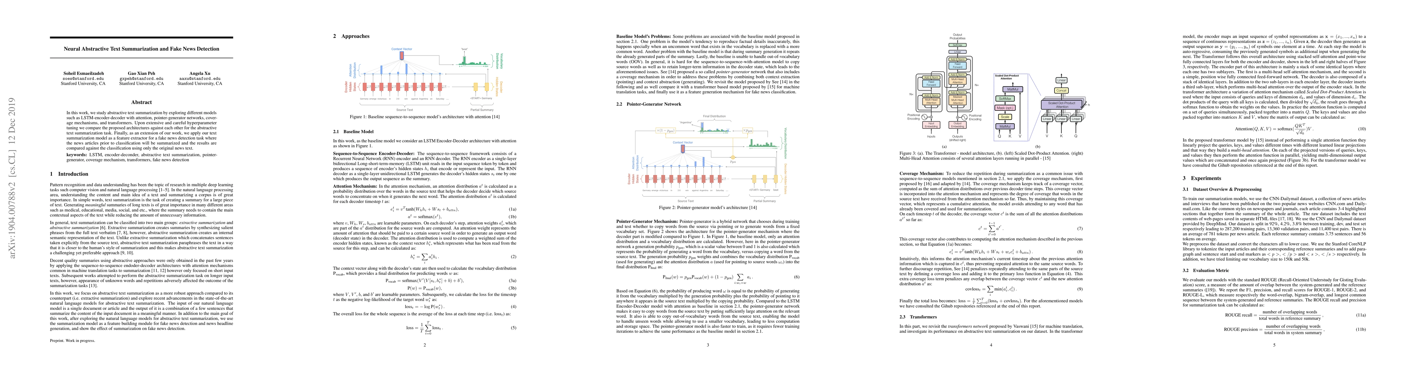 This paper investigates various neural models for abstractive text summarization, including LSTM-encoder-decoder, pointer-generator networks, and transformers. The study also explores using the summarization model as a feature extractor for detecting fake news, comparing its effectiveness against using the original text.