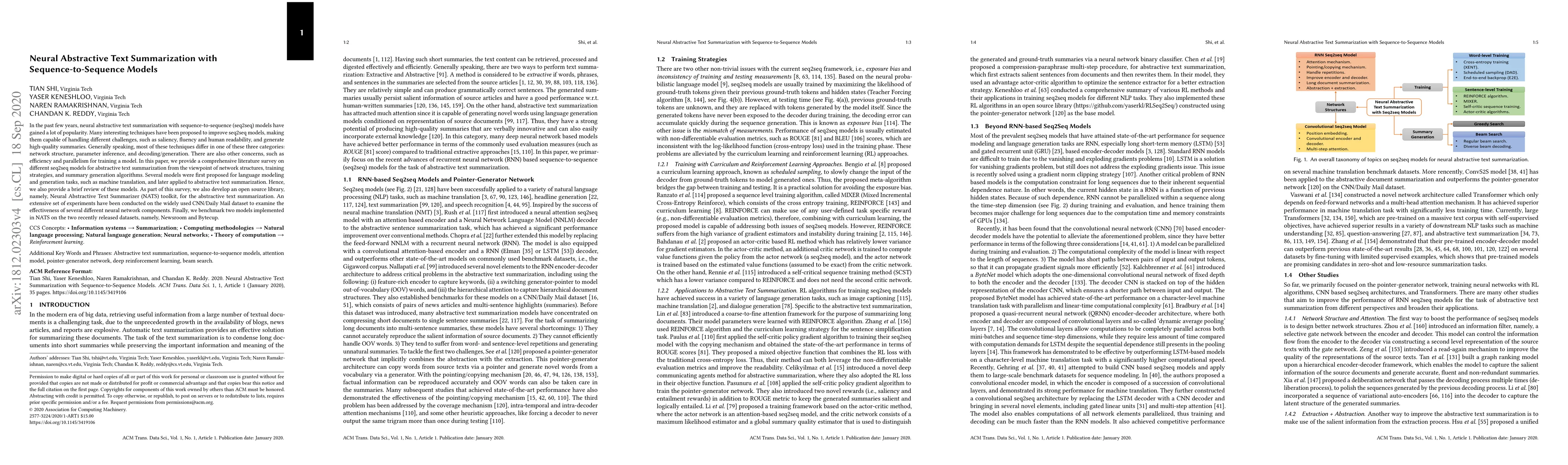 This paper surveys neural abstractive text summarization using sequence-to-sequence models, categorizing techniques by network structure, parameter inference, and decoding methods. It introduces an open-source library, NATS toolkit, and evaluates model effectiveness on CNN/Daily Mail, Newsroom, and Bytecup datasets.
