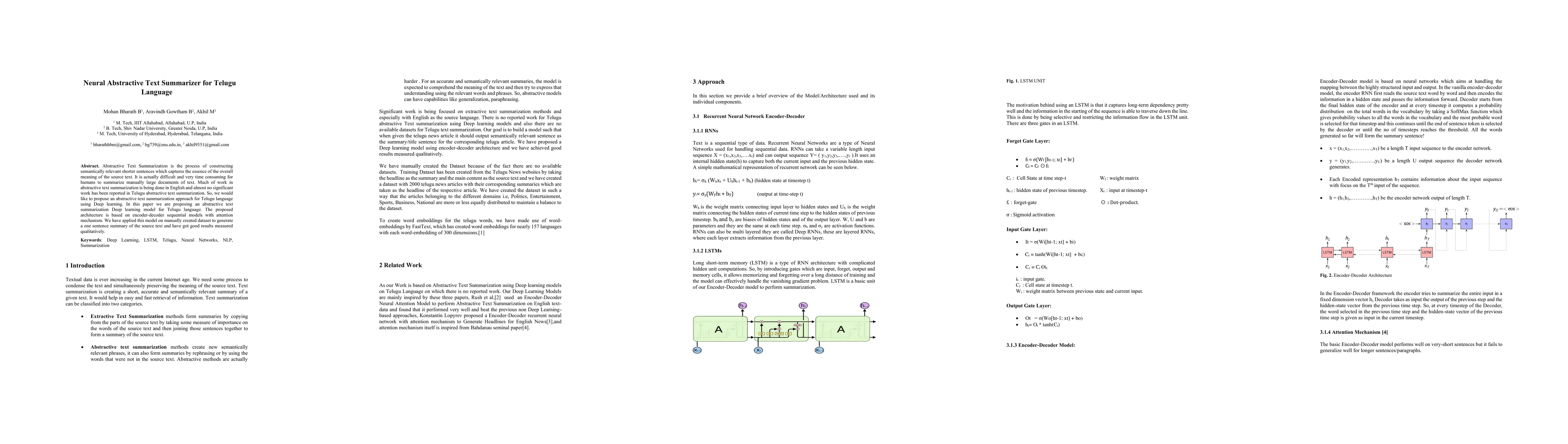 This paper proposes a deep learning model for abstractive text summarization in Telugu, utilizing an encoder-decoder architecture with an attention mechanism. The model effectively generates concise, semantically relevant summaries from large Telugu documents, addressing a gap in existing research.