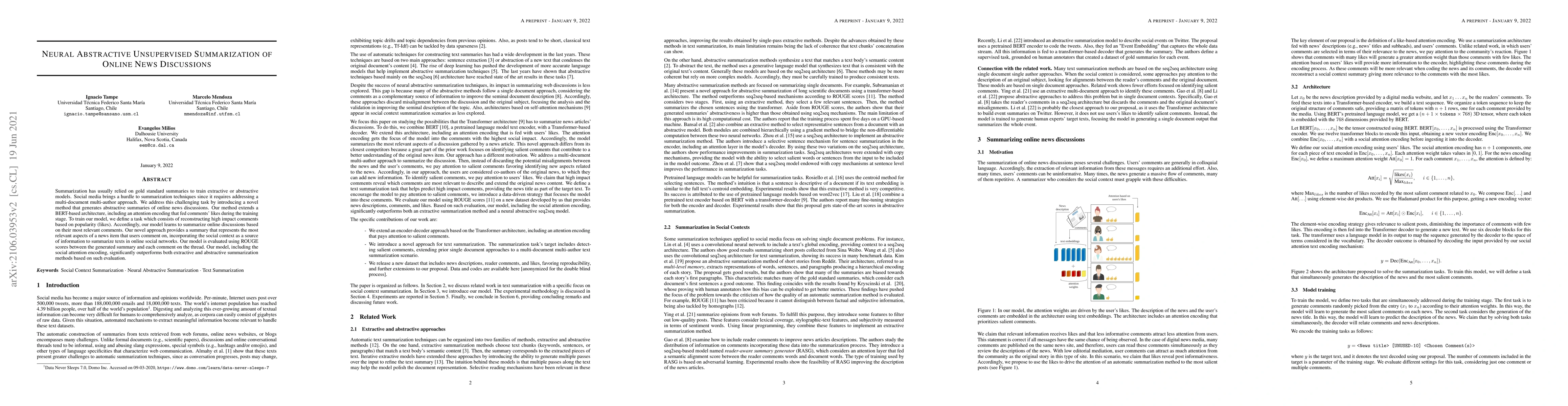 This paper proposes a neural method for generating abstractive summaries of online news discussions using a BERT-based architecture with an attention encoding that incorporates comment popularity (likes). The model outperforms existing summarization techniques in capturing the most relevant aspects of discussions by leveraging social context, as evidenced by higher ROUGE scores.