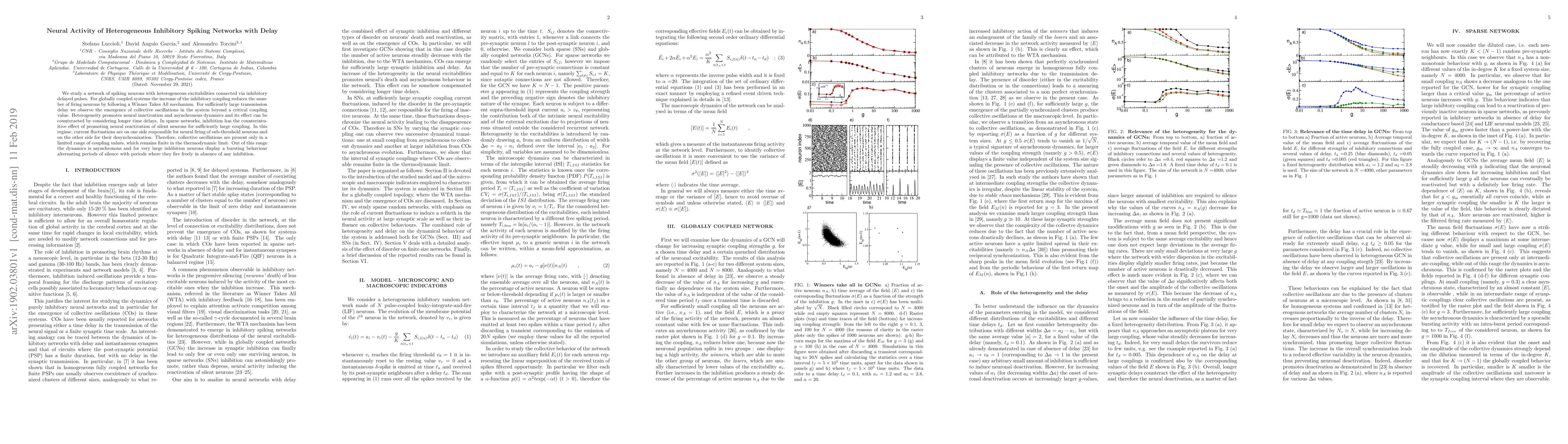 This paper investigates spiking neural networks with heterogeneous excitabilities and inhibitory delayed connections, finding that increased inhibition reduces firing neurons via a Winner Takes All mechanism. It also reveals that long delays can induce collective oscillations, while heterogeneity leads to inactivation and asynchronous dynamics, with inhibition paradoxically promoting reactivation in sparse networks.