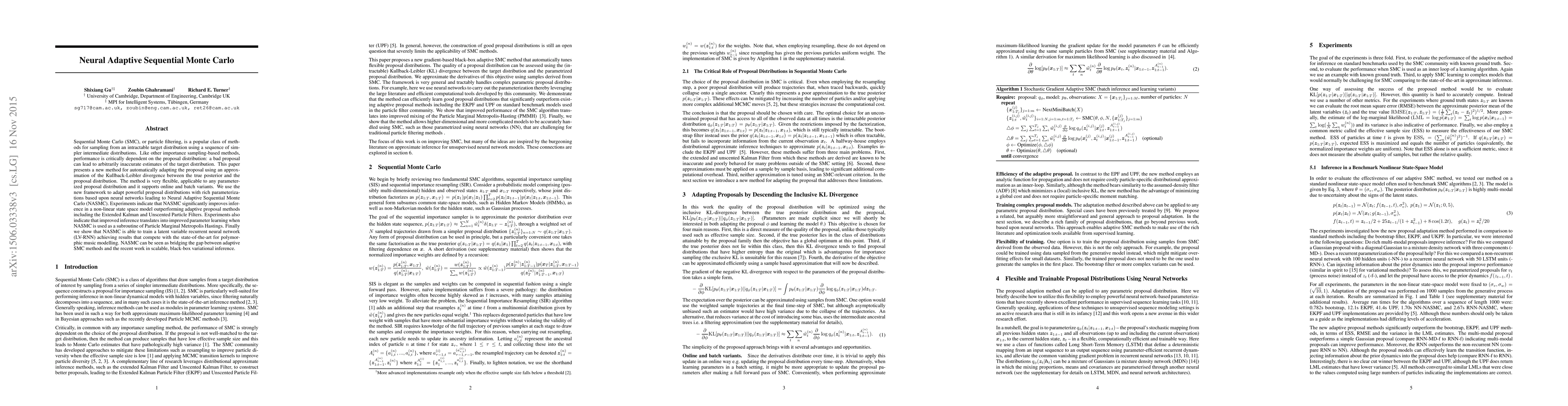 This paper introduces Neural Adaptive Sequential Monte Carlo (NASMC), a method that adaptively refines proposal distributions in particle filtering using neural networks to approximate the Kullback-Leibler divergence. NASMC outperforms traditional adaptive methods and achieves state-of-the-art results in complex inference tasks.