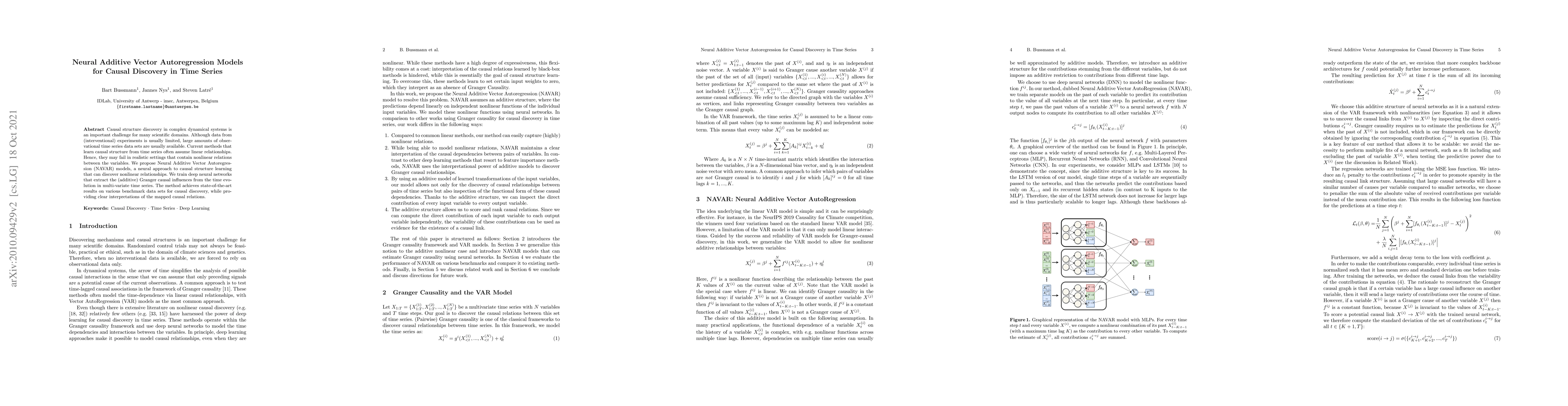 This paper proposes Neural Additive Vector Autoregression (NAVAR) models for discovering causal structures in complex, nonlinear time series data, outperforming existing linear methods and providing clear causal interpretations. The NAVAR approach leverages deep neural networks to extract additive Granger causal influences from multivariate time series data.