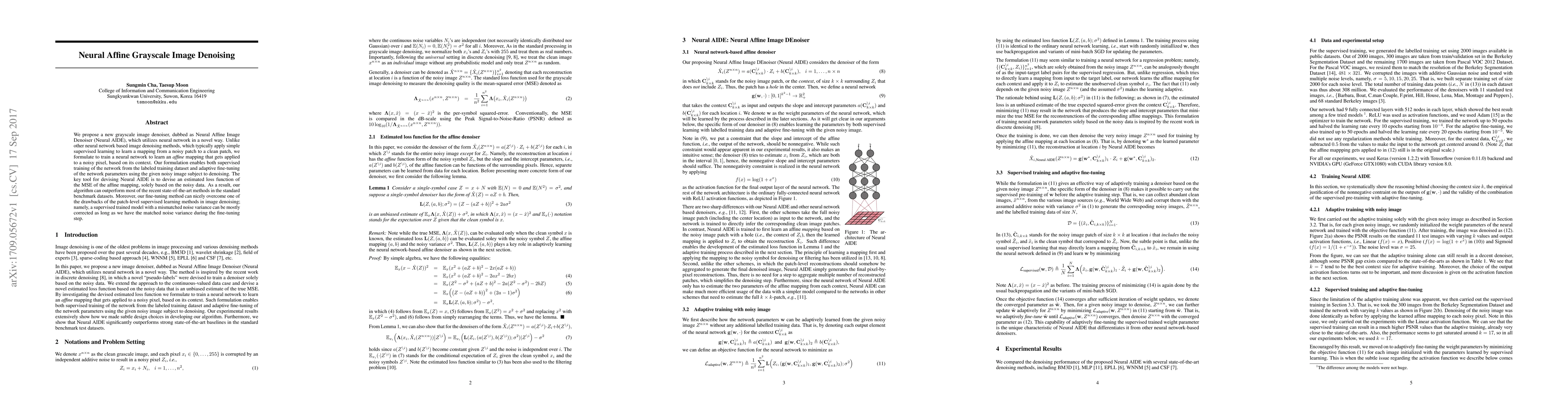 The Neural Affine Image Denoiser (Neural AIDE) method outperforms state-of-the-art methods in grayscale image denoising by learning an affine mapping of noisy pixels to clean ones based on context. It offers adaptive fine-tuning for correcting mismatched noise variances.