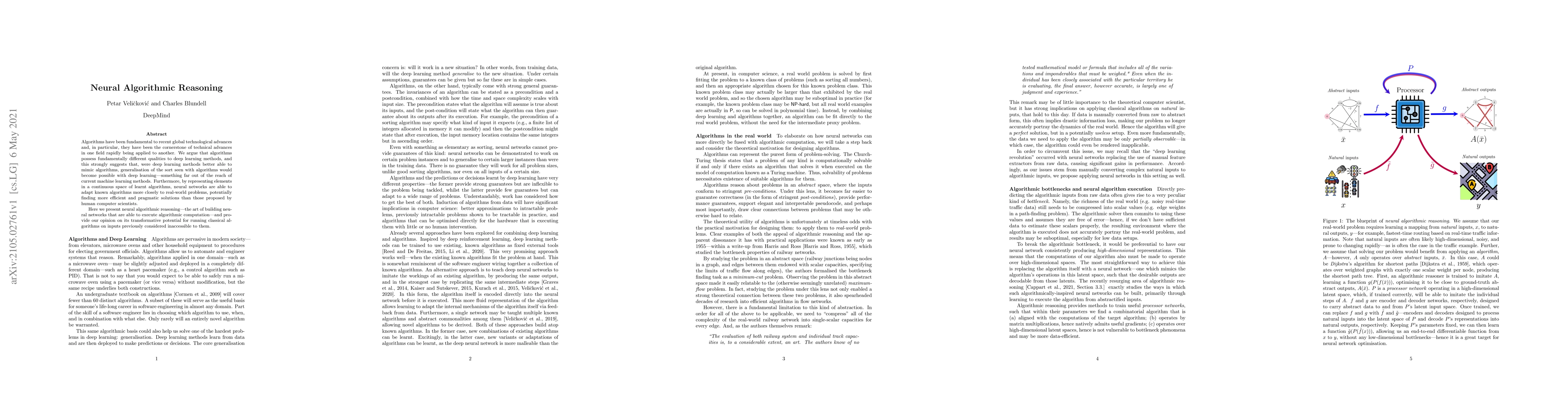 This paper introduces neural algorithmic reasoning, which aims to build neural networks capable of executing algorithmic computations, suggesting this approach could enable deep learning to generalize better and find more efficient solutions than traditional human-designed algorithms. It highlights the transformative potential of this method for adapting classical algorithms to new, previously inaccessible inputs.