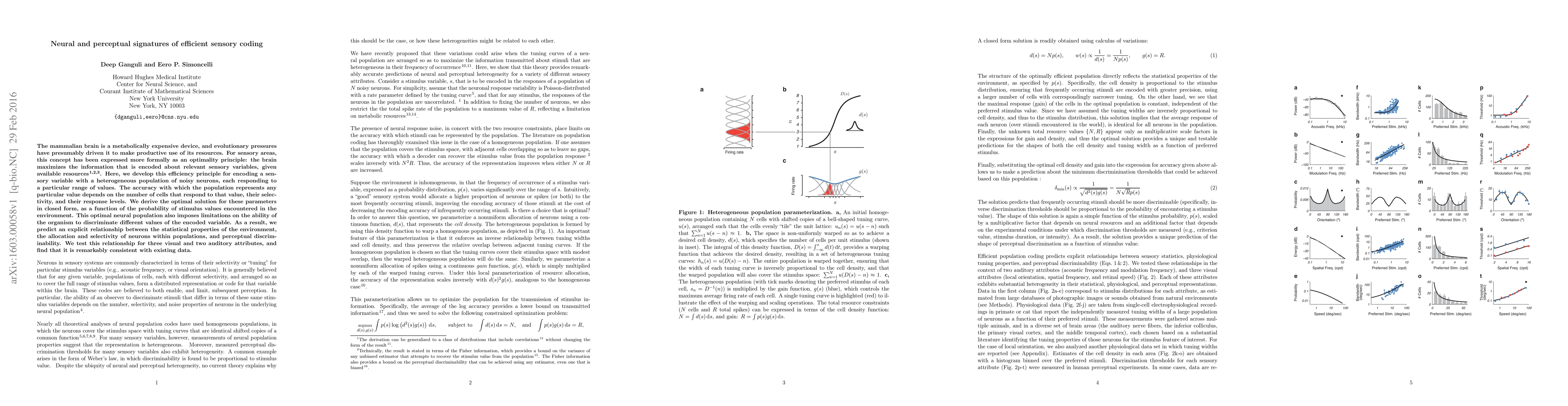 The mammalian brain is a metabolically expensive device, and evolutionary pressures have presumably driven it to make productive use of its resources. For sensory areas, this concept has been expressed more formally as an optimality principle: the brain maximizes the information that is encoded about relevant sensory variables, given available resources. Here, we develop this efficiency principle for encoding a sensory variable with a heterogeneous population of noisy neurons, each responding to a particular range of values. The accuracy with which the population represents any particular value depends on the number of cells that respond to that value, their selectivity, and their response levels. We derive the optimal solution for these parameters in closed form, as a function of the probability of stimulus values encountered in the environment. This optimal neural population also imposes limitations on the ability of the organism to discriminate different values of the encoded variable. As a result, we predict an explicit relationship between the statistical properties of the environment, the allocation and selectivity of neurons within populations, and perceptual discriminability. We test this relationship for three visual and two auditory attributes, and find that it is remarkably consistent with existing data.