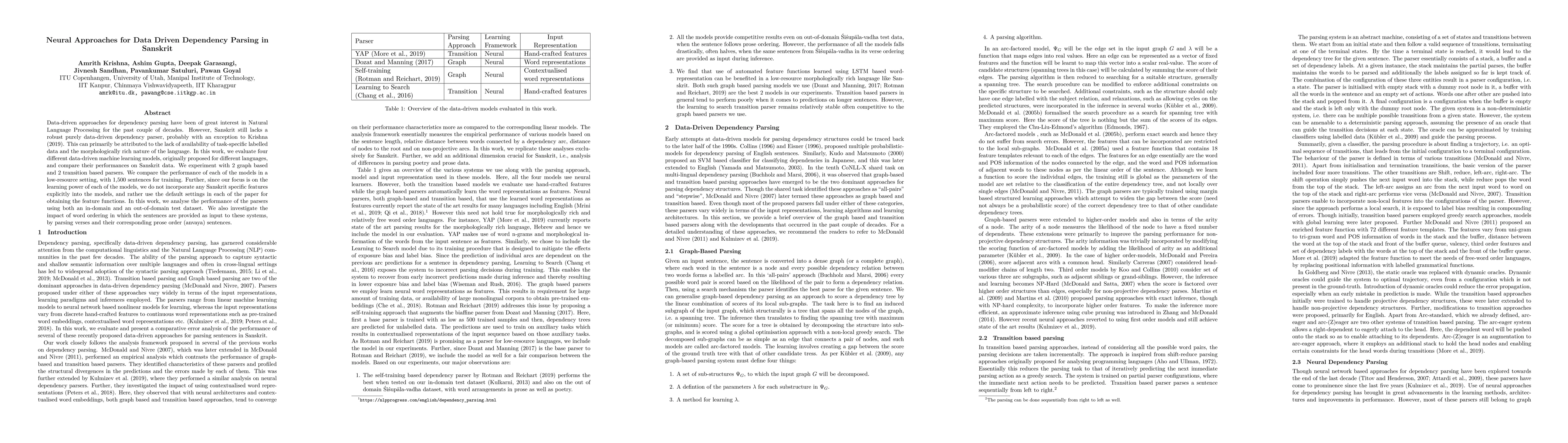 The paper evaluates four neural dependency parsing models (two graph-based and two transition-based) on Sanskrit data, using 1,500 sentences for training without incorporating Sanskrit-specific features explicitly.