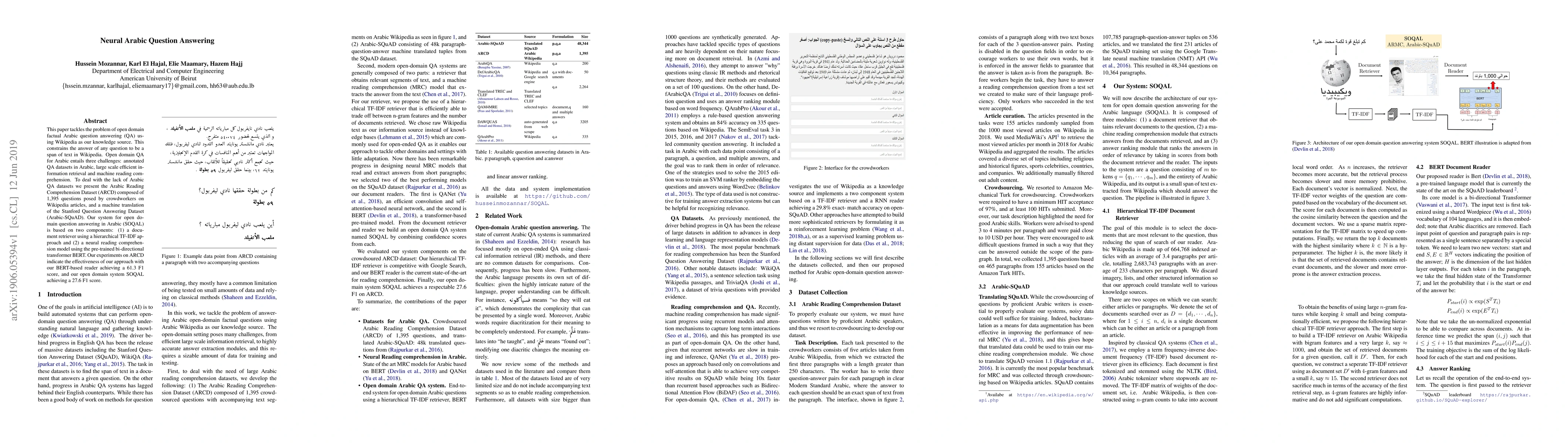 This paper introduces a system for open domain factual Arabic question answering using Wikipedia, addressing challenges like the scarcity of Arabic QA datasets and machine reading comprehension. It presents the Arabic Reading Comprehension Dataset (ARCD) and a machine-translated Arabic-SQuAD, and utilizes a hierarchical TF-IDF retriever and a BERT-based neural reader, achieving notable performance in experiments.